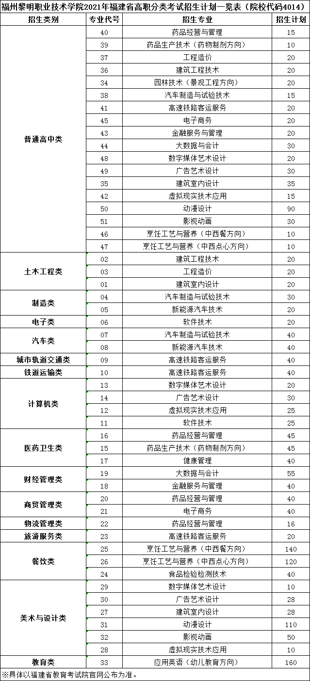 福州黎明职业技术学院2021年福建省高职分类考试招生计划一览表(院校代码4014)