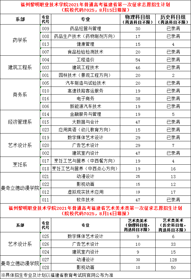福州黎明职业技术学院2021年普通高考福建省第一次征求志愿招生计划
