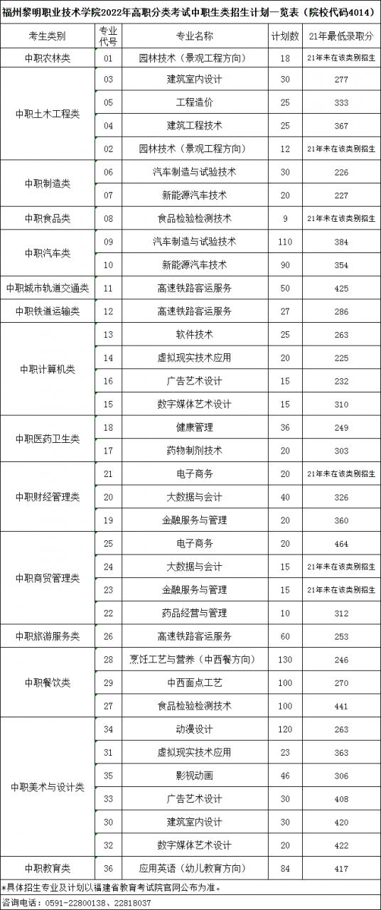 福州黎明职业技术学院2022年高职分类考试中职生类招生计划(院校代码4014)
