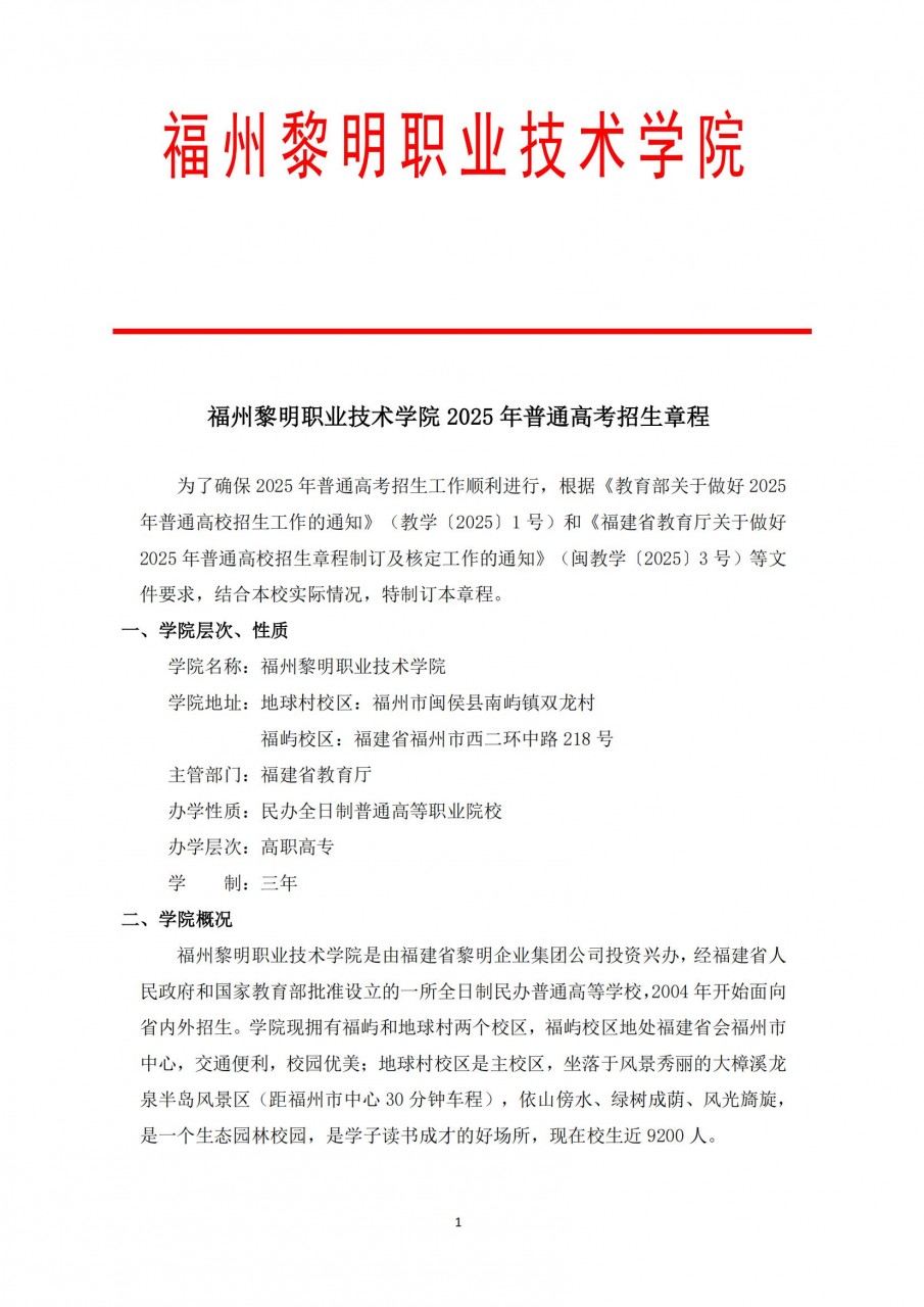 福州黎明职业技术学院2025年普通高考招生章程