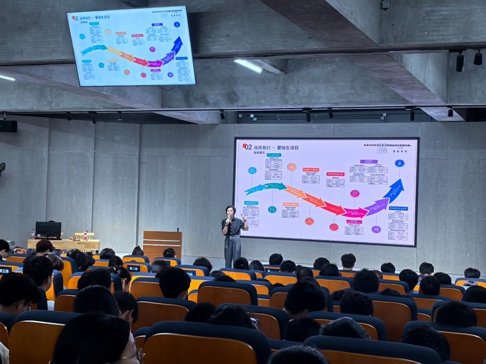 林瑞校友进行了“怎样度过大学生活--以终为始的大学学业计划”的主题分享。她向新生们分享了自己不同时期的大学生生活和学习的经验,还结合实际案例,为同学提供了切实可行的策略和建议。这些宝贵的经验如同一盏明灯,照亮了同学们前行的道路,帮助他们为自己未来的职业发展铺就坚实的基石。