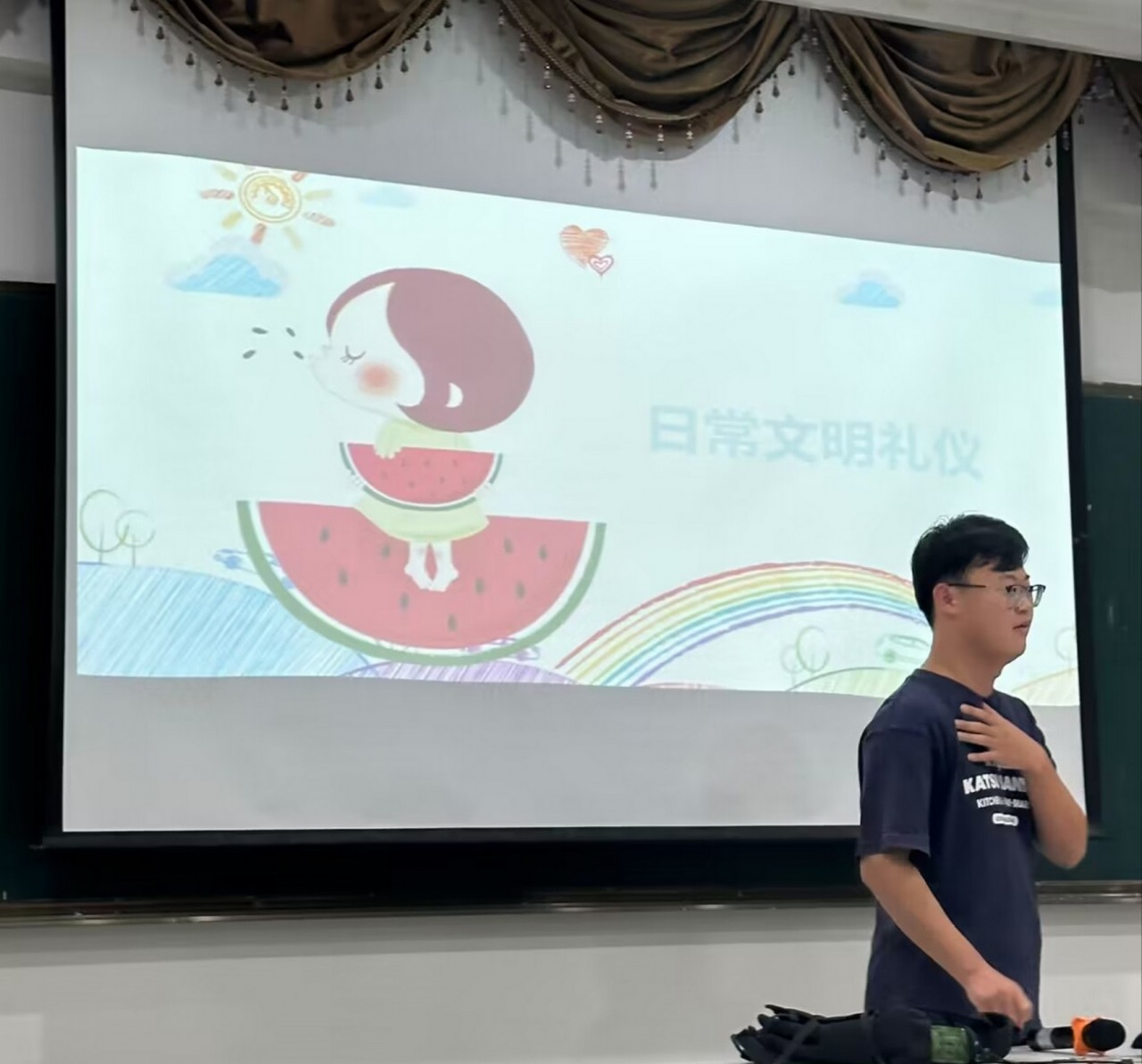 在主题班会上辅导员向同学们讲解我们在校园里,文明应如何做?首先要做到礼貌待人,见到老师主动问好,与同学相处要互相尊重,其次谦恭礼让,举止文明,穿戴整齐,自觉维护公共财产,不随地吐痰。谦虚恭敬的态度和言行,是尊重他人美德的外在表现形式,文明礼貌是处理人与人之间关系的一种行为规范,表现出个人的文化内涵和良好修养,是社会活动良性运转必不可少的交往方式。