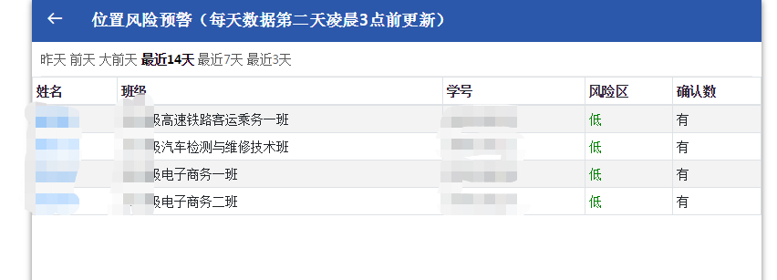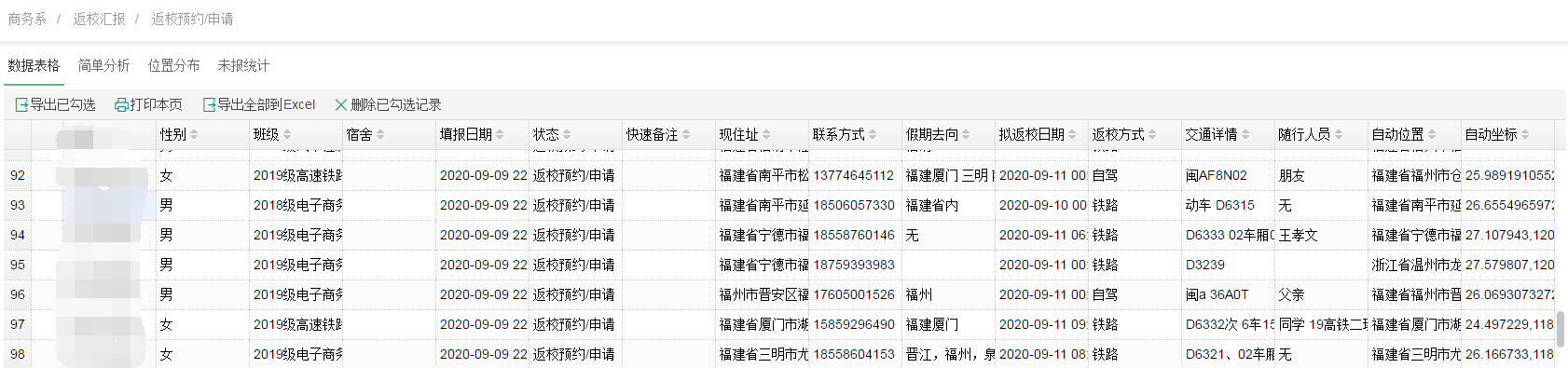 利用数字化加强学生返校前信息动态监测。利用先期建立的班级魔方组织网络,加强健康日报工作,获取学生每日健康和GPS精准位置信息自动上报,以及漏报提醒、学生风险位置异动预警与提醒、中高风险地区学生每日报告、有确诊数量区域学生每日报告等情况动态掌握师生员工身体健康状况。党支部书记、辅导员第一时间可以通过手机准确掌握学生整体返校、重点地区学生及其他分类分班级学生返校情况,有利于精准实施网格化管理、教学生活等相关工作。