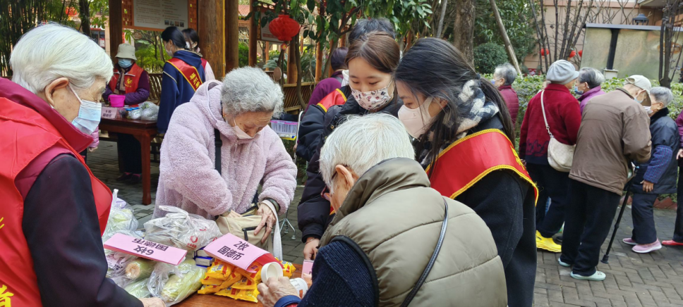 活动当日,恰逢康养中心举办丰富老年人生活的赶集日活动。现场热闹非凡,摊位琳琅满目。志愿者们一抵达,便迅速投身活动,协助主办方开展工作。他们有的帮忙布置摊位,摆放商品;有的引导老人有序购物,耐心为老人介绍各类物品;还有的陪伴在老人身边,帮忙拎东西,时不时与老人谈笑风生。