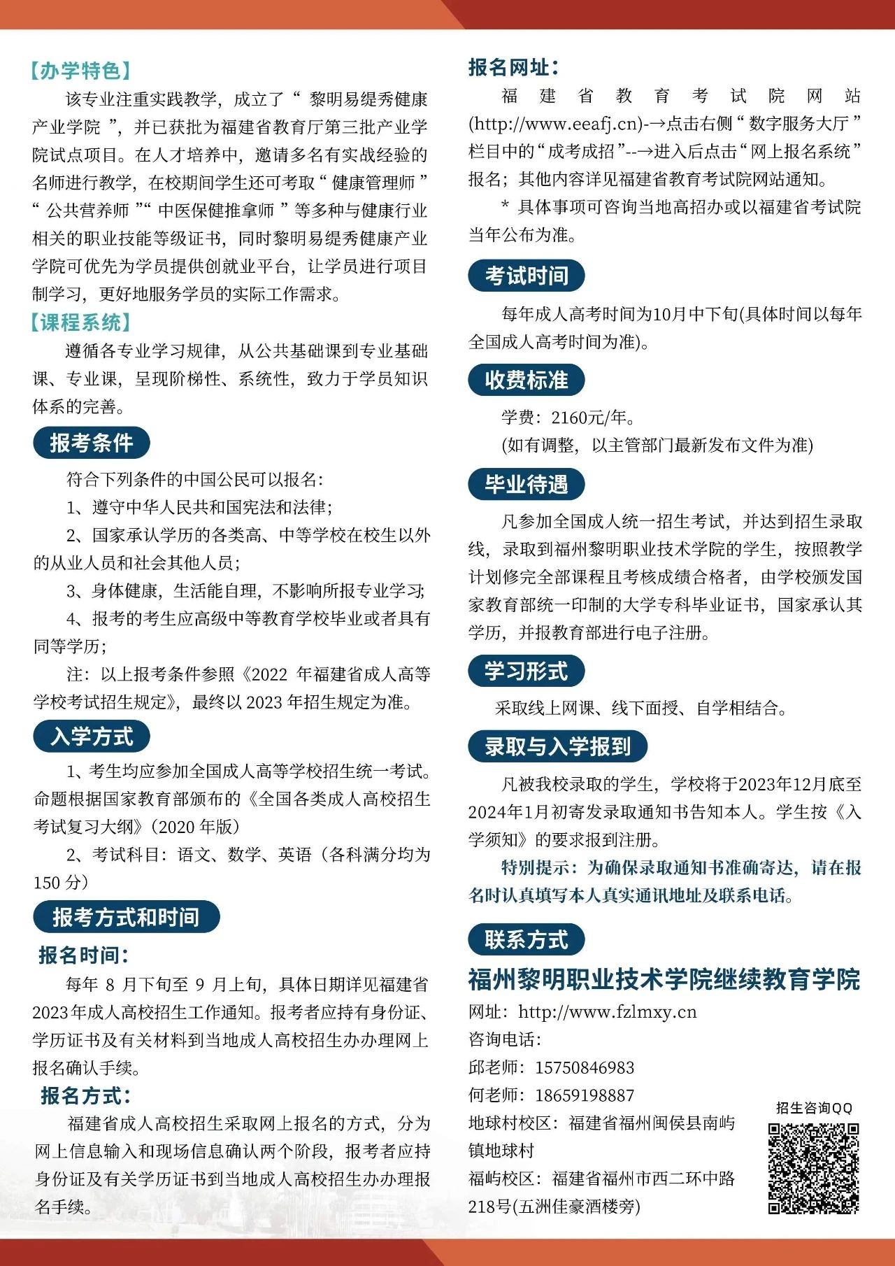 福州黎明职业技术学院2023成人高等教育招生简章