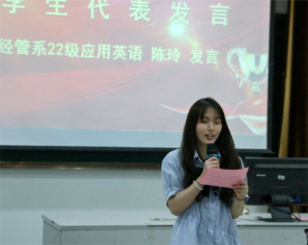 紧接着,学生代表陈玲上台发言。她强调了努力、方法和心态对于成功的重要性,并分享了自己选择升本的心路历程和未来的学习规划。她以“不忘初心,方得始终”作为结语,鼓励大家坚守初心,勇往直前,追求更高的学习目标。