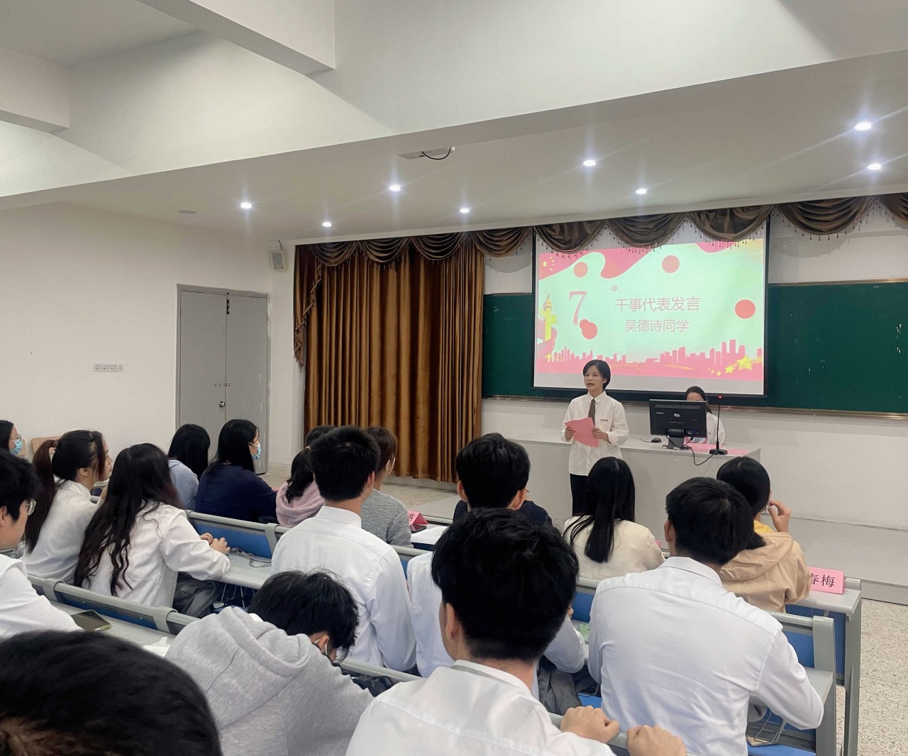 仪式开始,由20级虚拟专业的刘俊畅同学主持开场,宣布第十一届艺术设计系第十一届“两委一会”授牌仪式暨第一次全体大会正式开始。本次活动,第一个环节,由李彬垠副书记宣读新一任两委一会学生干部名单,紧接着全体干部进行宣誓,表明他们要在今后全心全意为系部全体师生服务的决心;第二个环节,主席团、学生干部发言,报告本学期团学工作计划与寄语;第三个环节,全体同学观看了习近平总书记在庆祝五四运动胜利80周年大会上的发言视频,通过视频大家知道了青年同志在党和国家的建设上所扮演的重要角色,以此提醒自己要时刻努力奋斗;第四个环节,由老师们为2021级新生干事颁发工作牌,新生干事代表室内专业的吴德诗同学作为代表进行就职发言。
