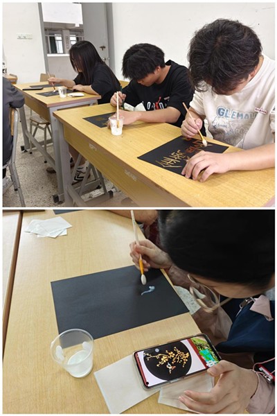 活动当天,工作人员为同学们准备好,金箔、卡纸等绘画时所需要的工具,各位同学入场开始自己的创作,大家精心绘制出自己喜爱的图案,恰逢24年高考前夕,很多同学也通过作品来表示对莘莘学子的祝福,大家都屏息静心细心制作,沉浸式体验非遗文化。经过几个小时的认真制作与体验,薄如蝉翼的金箔画跃于纸上,每一幅画作都凝聚了自己的心血。在这过程中,同学们纷纷感受到非遗手工带来的清风意蕴。