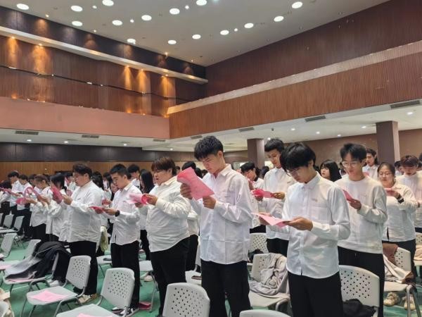 仪式在庄严的团歌声中开始。随着高涨的歌声结束,接下来由学生干部代表黄腾俊上台发言。他首先对新一届学生干事的加入表示热烈的祝贺,从他的亲身体验告诉大家通过在部门里不断地学习和实践,去注重自身能力的培养,完善和提升自身欠缺的部分,最后希望大家能够珍惜在部门里的时光,享受美好的校园生活。