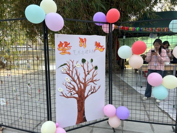 活动在入口处设置了创意签到区,参加活动同学们会选择自己认为有意思的叶子夹到铁架上,“生命之树”在同学们的手下绽放。