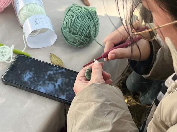 综合楼前草坪之上,创意与巧思交织汇聚。现场特设报名点位,专业指导老师亲临亲授钩针编织技法。活动分设教师组与学生组,创作过程中,师生们将奇思妙想凝于针脚、融于绒线,作品主题昂扬、形式多元,玲珑挂饰与实用好物兼具,每一件成品皆是心血与巧思的凝练。