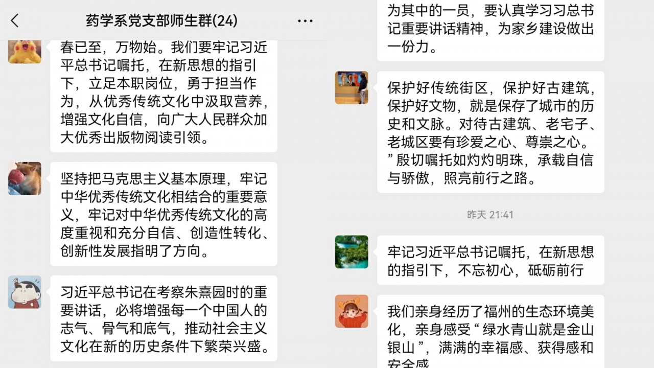 通过此次观看完节目,药学系党支部全体师生党员感悟颇深,并在线进行分享。教师党员吴丹丹说:在习总书记的指导下,让我们有幸亲身经历了福州的生态环境美化,感受‘绿水青山就是金山银山’,满满的幸福感、获得感和安全感;学生党员秦经斌说:闽山闽水寄深情,习总书记对寄予厚望,让同为福建人民的我倍感温暖,备受鼓舞,并时刻牢记为家乡建设做出一份力。支部书记郑爱清说:通过荧幕上的宣讲,重温总书记的嘱托,作为党员的我们应当深入学习总书记重要讲话、重要指示精神,疫情当下牢记坚持就是胜利,全力以赴打赢疫情歼灭战,共同守护好人民群众生命安全和身体健康,感恩奋进向未来。