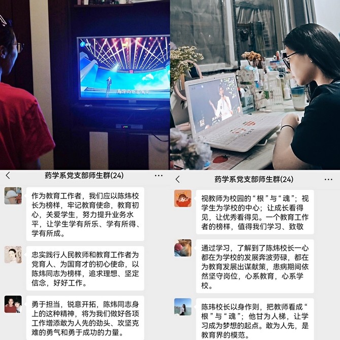 药学系组织全体师生认真观看学习,节目结束后大家纷纷线上分享观看感受。学生秦经斌说:陈玮校长的精神值得我们学习,他一心坚持党的教育方针,为教育做出贡献,即使身患重病也能无所畏惧砥砺前行,勇于担当,关爱学生,这种崇高的品质是我们学习的榜样。支部书记郑爱清说:爱的教育,在传递,我们要牢记初心使命,胸怀“国之大者”,坚定教育报国理想信念;要坚持终身学习,增强学识本领,努力成为业务精湛、学生喜爱的高素质教师;要坚持以学生为中心,落实立德树人根本任务,把温暖和情感倾注到每一位学生身上。