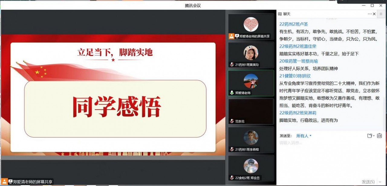 会议的气氛逐渐变得热烈起来,同学们学习情绪高涨,在郑爱清书记的鼓励下,纷纷在会议的聊天窗口讨论作为新时代的新青年,该如何践行二十大的精神,释放出蓬勃的活力。几位同学踊跃发言,打开麦克风,慷慨地陈述自己对青春规划的见解。