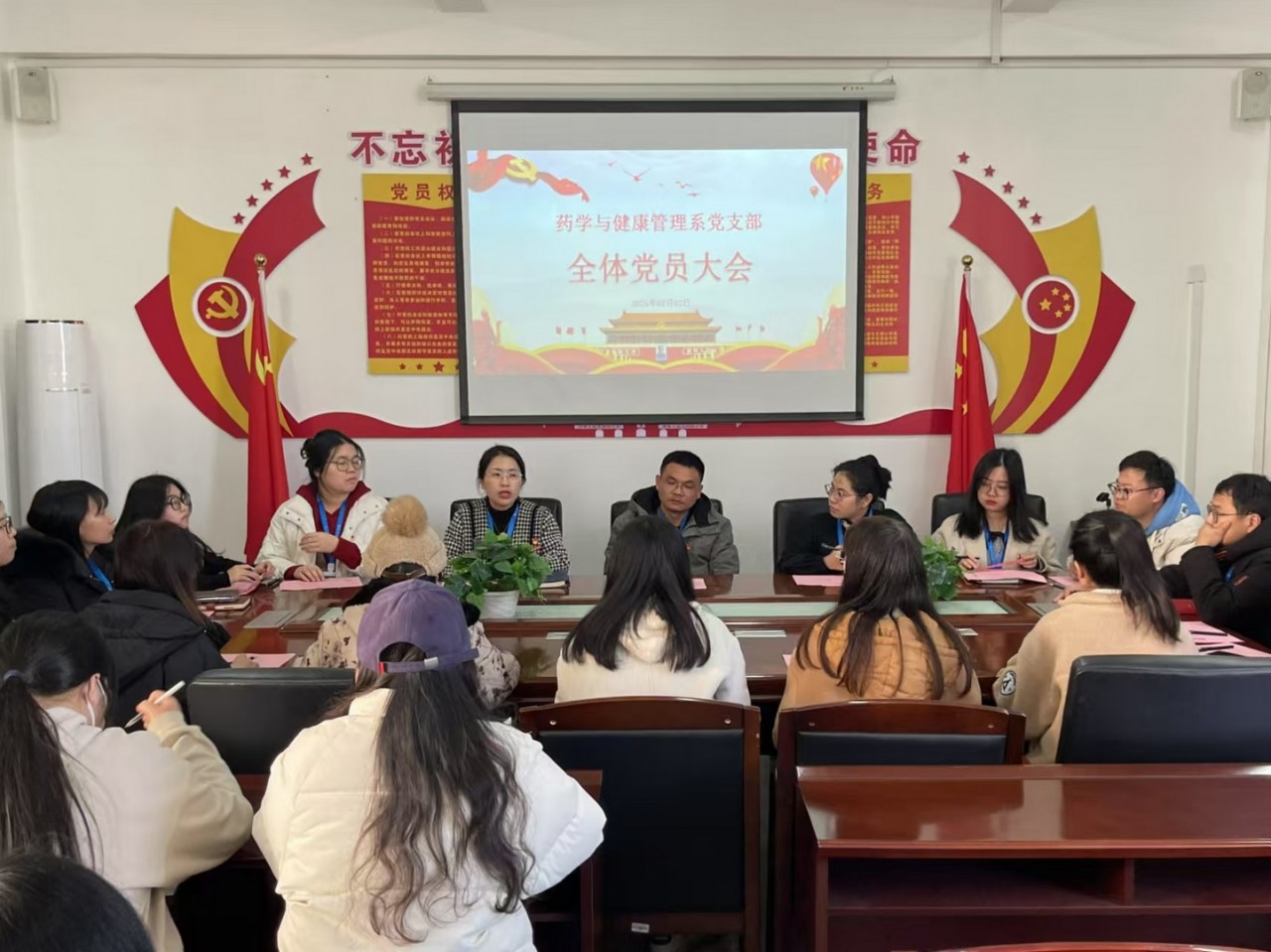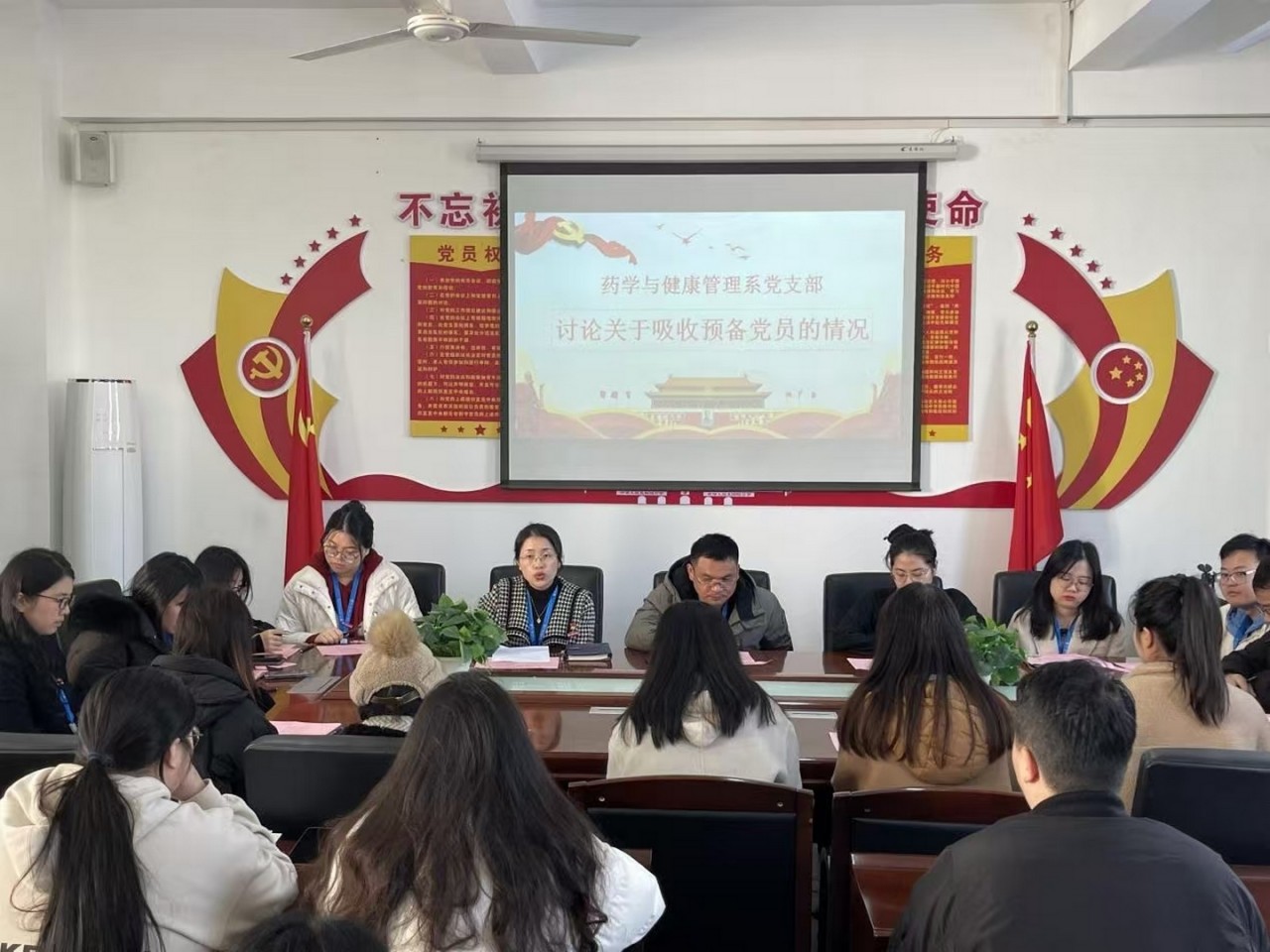 为响应党的号召,培养优秀党员,注入新鲜血液,推动我系党员队伍的发展,2025年1月2日下午,药学与健康管理系党支部在会议室隆重召开2024年下半年预备党员接收大会,讨论赵琳琳、翁舒洁二位同志的发展问题,由党支部书记郑爱清主持会议,严格按照组织程序进行。大会应到党员19名,实到党员18名,符合规定人数,可以召开会议。
