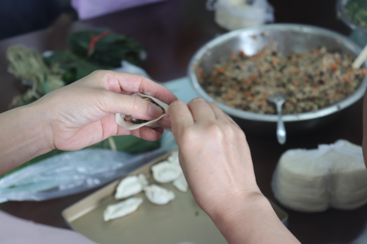 悠悠粽叶香,浓浓包粽情。药学系提前一天准备好了粽叶、糯米、腌肉、线绳等原材料和筷子、盆子、一次性手套、礼盒等工具。学校的老师们可谓“上得课堂,下得厨房”,每位老师纷纷动手,一展自己的“大当家”本领。活动中,会包粽子的老师熟练的手法,必是有故事的人;不会包的老师也虚心地拜师学艺,有经验的老师们积极向新学的老师们传授经验,通过反复的练习,最后也“粽”成正“裹”。大家包着、笑着、展示着,成功的喜悦、粽情的笑声。