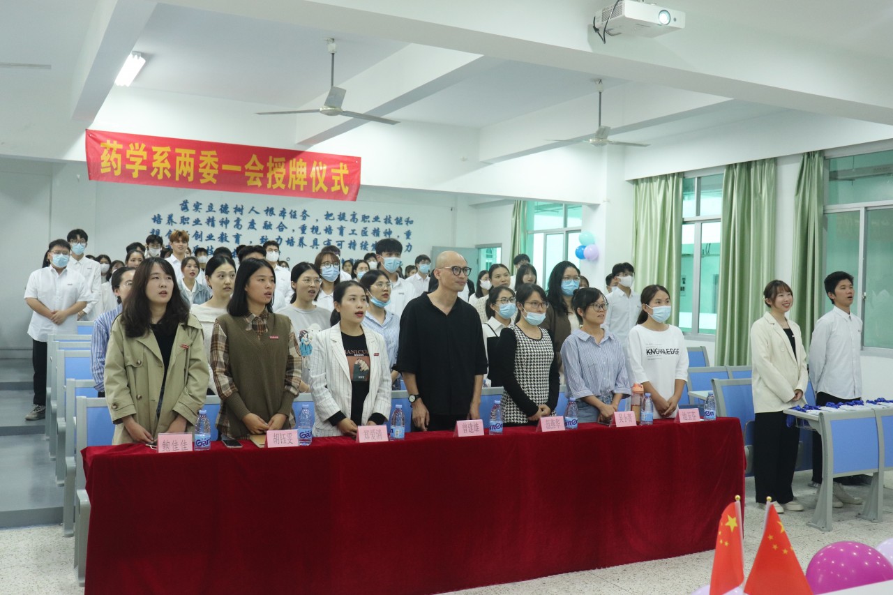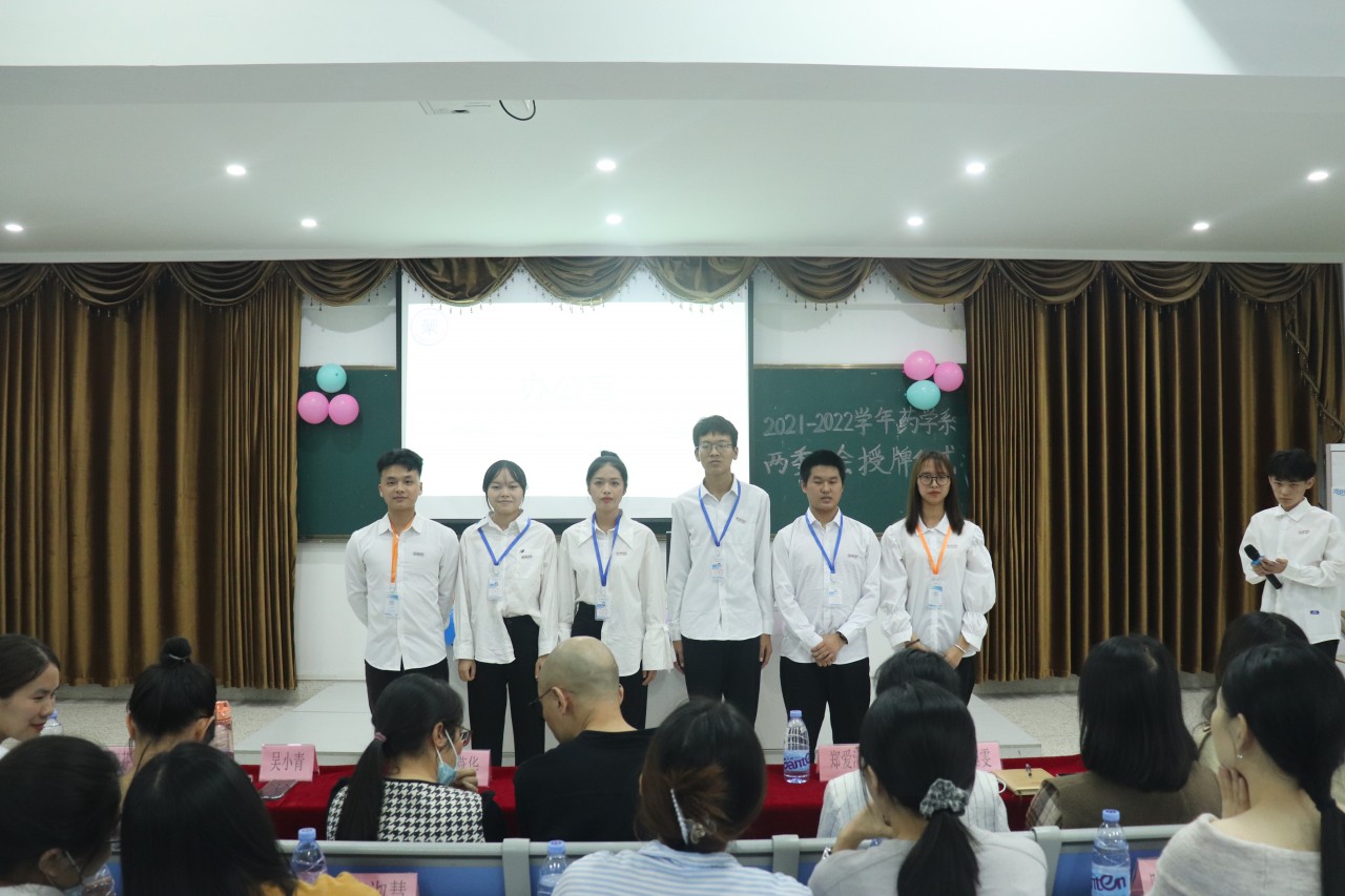 2021年10月19日下午两点三十分在阶梯二教室举行药学系“两委一会”新干部、新干事授牌仪式,此次到场的嘉宾有药学系主任曾建雄老师、药学系党支部书记郑爱清老师、辅导员胡钰雯、鲍佳佳老师、各班级班主任及药学系“两委一会”全体成员。以团歌《光荣啊,中国共青团》唱响此次会议的开始。