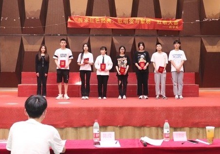 接下来,在传承红色经典的同时,学院理念“爱的教育”也一直从未忘记,当学院校歌《爱在黎明》唱响时,又把比赛推向另一个高潮,彰显了同学们对爱的教育的美好憧憬,同学们用歌声传递情感,用歌声传递爱的故事,歌唱爱与黎明,发扬学院“爱的教育”理念。美好的时光总要结束,随着时间的流逝,此次比赛迎来了尾声,最后,院学生会主席王朝鳞同学对本次活动做了点评。在紧张又激动的气氛中,由主持人宣布晋级名单,评委上台为晋级班级颁奖及合影留念。
