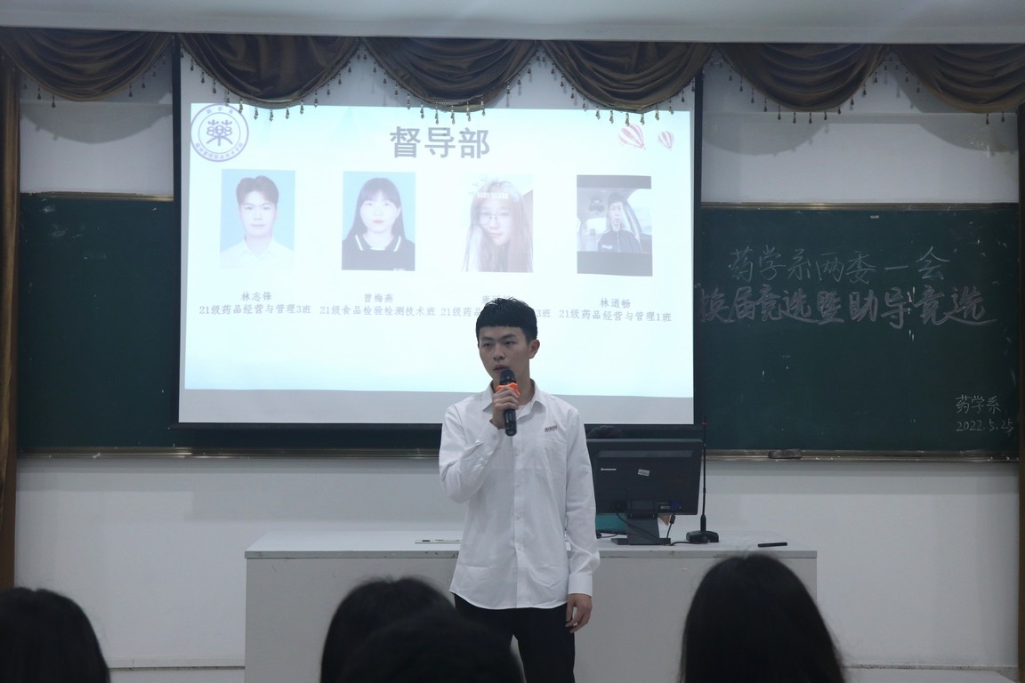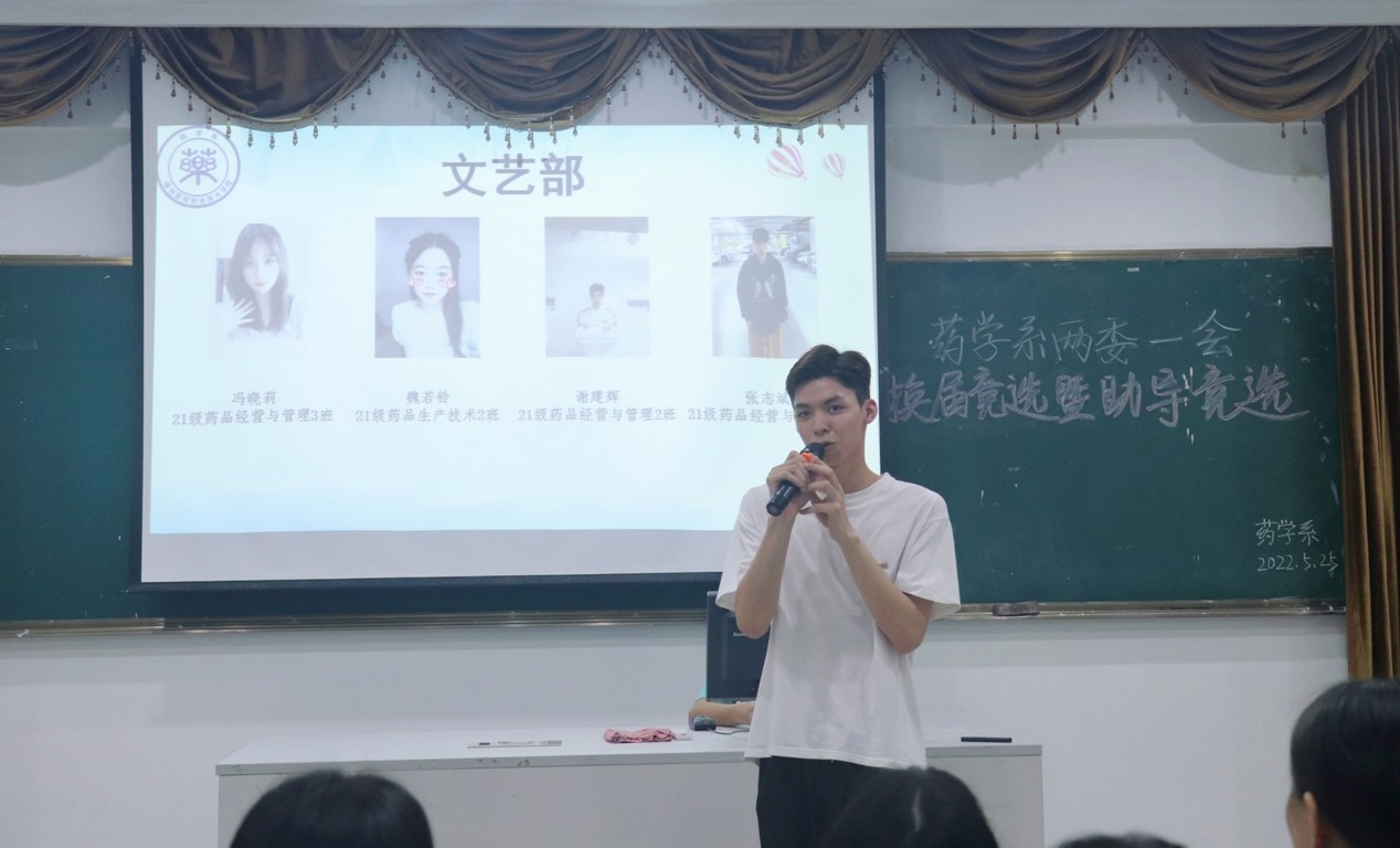 为保证有足够高素质的后备力量,充分发挥学生的主体作用。药学系新一届“两委一会”干部换届竞选活动于2022年5月25日17:30在综合楼阶梯二教室举行。出席本次活动的有药学系团总支副书记鲍佳佳老师、辅导员林玫老师、吴爱琴老师以及两委一会的所有成员。