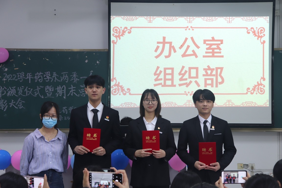 2022年6月9日下午2:40药学系于阶梯三(219)教室进行两委一会聘书颁发仪式暨期末总结表彰大会。出席本次活动的嘉宾有药学系团总支副书记鲍佳佳、辅导员林玫以及药学系的其余任教老师们。由谢建辉、冯晓莉同学主持本次表彰大会。