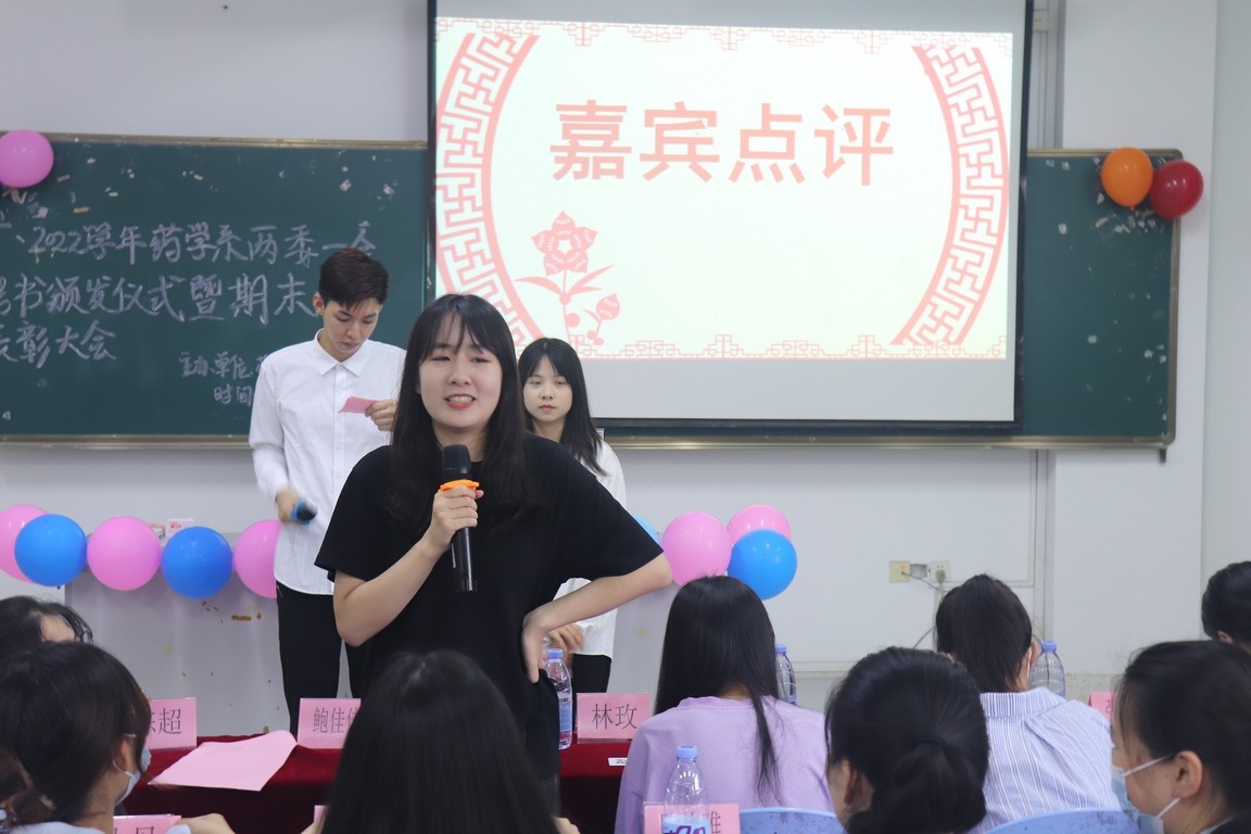 最后由药学系团总支副书记鲍佳佳对本场活动进行点评,向受表彰的同学表示衷心的祝贺,同时对他们所作的努力表示肯定和赞扬并希望他们时刻严格要求自己、继续努力。
