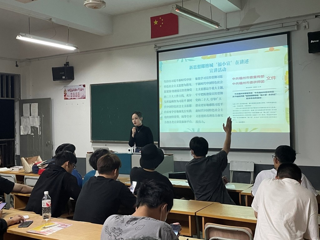 为深入学习宣传贯彻习近平新时代中国特色社会主义思想,喜迎党的二十大胜利召开,根据《中福建省委宣传部中共福 建省委讲师团关于组织开展“新思想耀八闽‘福小宣’在身边”宣讲活动的通知》(闽委讲联〔2022) 7号)要求,于2022年10月23日晚上在各教室召开“新思想耀榕城‘福小宣’在讲述”宣讲活动。此次大班会由药学系各辅导员主持,参加此次会议的人员为药学系全体同学。