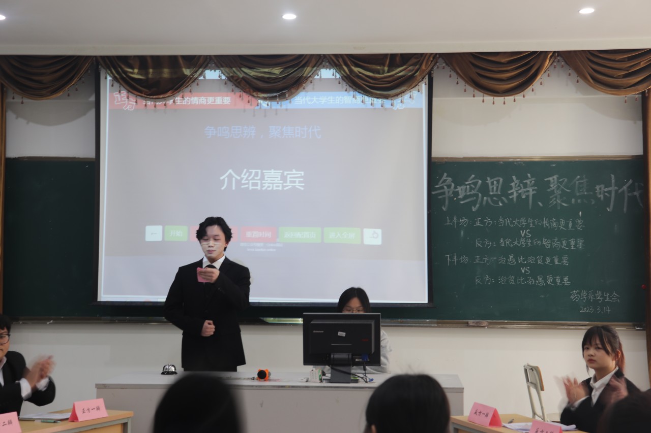 精于恩美于言,秀于心慧于口。为活跃校园文化气氛,丰富学生的课余生活,增强学生明辨是非能力、逻辑恩维能力和语言表达能力,提高学生的辩论水平,发掘培养学校辩论人才,体现当代大学生风华正茂的精神状态。药学系于2023年3月14日15:30举办第十二届“争鸣思辨,聚焦时代”决赛。辩论赛特邀团总支副书记黄星老师、辅导员柯枝敏老师、吴爱琴老师、院学生会代理主席陈欣怡同学、院学生会代理副主席兼院学生会办公室主任方嘉琪同学、经济管理系学生会主席张振熙、药学系学生会副主席郑惠琼同学担任评委。比赛分为上、下两场。