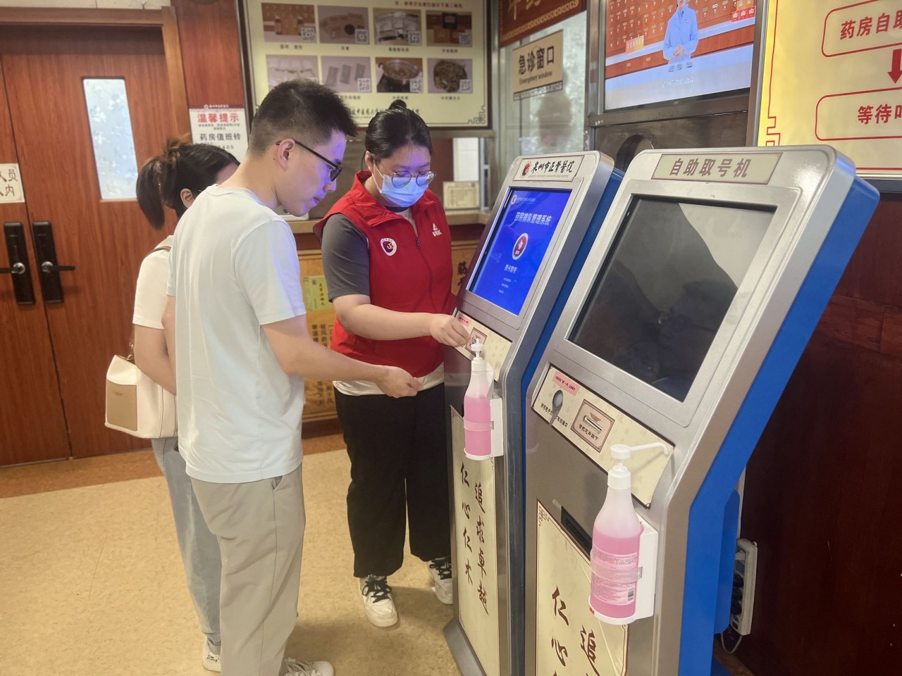 志愿者们经过严格的岗前培训后,在医院的安排下,有到门诊咨询处引导患者签到的,有协助患者及其家属操作自助服务机的等等。 刚开始,志愿者们对操作流程还不熟悉,但在医护人员的帮助下完成了几个患者服务后,他们很快找到了方法,并积极总结出工作要领,一下子就从“小白”化身成导诊“高手”,为患者就医提供了极大的便利。志愿者有时还会“脱岗”,亲自陪伴一些独自来就医的老人及特殊人士挂号就诊,志愿者们的耐心和热心,让他们感觉到如家人般的亲切和温暖,进一步拉近医患之间的距离,收到了患者们的热烈欢迎和一致好评。