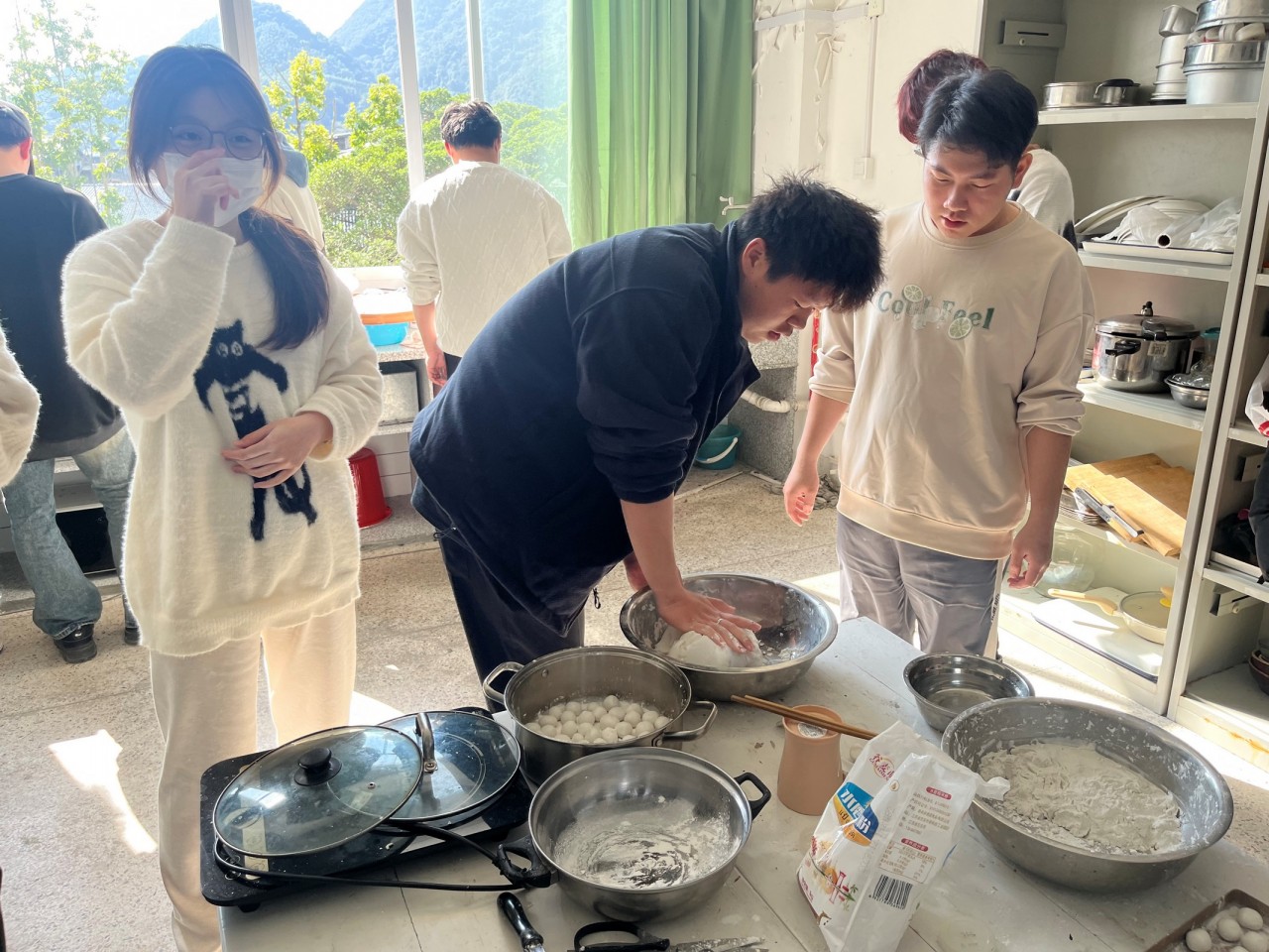 紧接着,活动开始,大家分工明确,早早就准备好食材,有的烧开水,有的和面揉粉。然后将一块块白花花的面团搓成球状,经过大家的努力,一会儿功夫,就已经搓出一盆盆圆滚滚的汤圆。