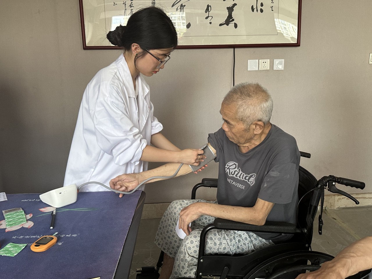 在西太云医智能康养中心,首先在工作人员的指引下我们来到康养中心所提供的工作场所摆好设备用具,药学与健康管理系的师生们化身健康守护者,精心为每一位老人进行血糖测量与血压检测。他们耐心地操作着仪器,仔细观察数据,根据现场测出的数据以及结合康养中心每日监测记录,细致为老人分析身体状况,给予专业的健康建议。“您血糖稍微偏高,饮食得少糖少油”、“血压挺稳定,还得保持规律作息”等一句句温馨的叮嘱,宛如春日暖阳,照亮了健康养老中心老人们的心房。医护人员的专业关怀,不仅为老人筑牢健康防线,更用真心传递温暖,赢得了老人与工作人员由衷的赞誉与认可。