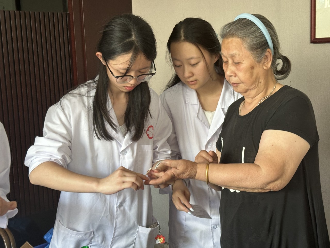 小陶镇五一村同样热闹非凡,在当地镇政府和村委会的协助配合下,将此次义诊消息传达到每一个村民,村民们得知义诊消息后,早早地来到现场排队等候,来到现场的长者多达三十余人。师生们热情地为长者们服务,一边熟练地操作着医疗设备,一边亲切地与大家拉家常和了解他们的生活习惯。测血糖、量血压,每一个环节都一丝不苟,用专业知识为长者们的健康保驾护航,让这份关怀在乡村中传递,让红色基因在服务中闪耀。