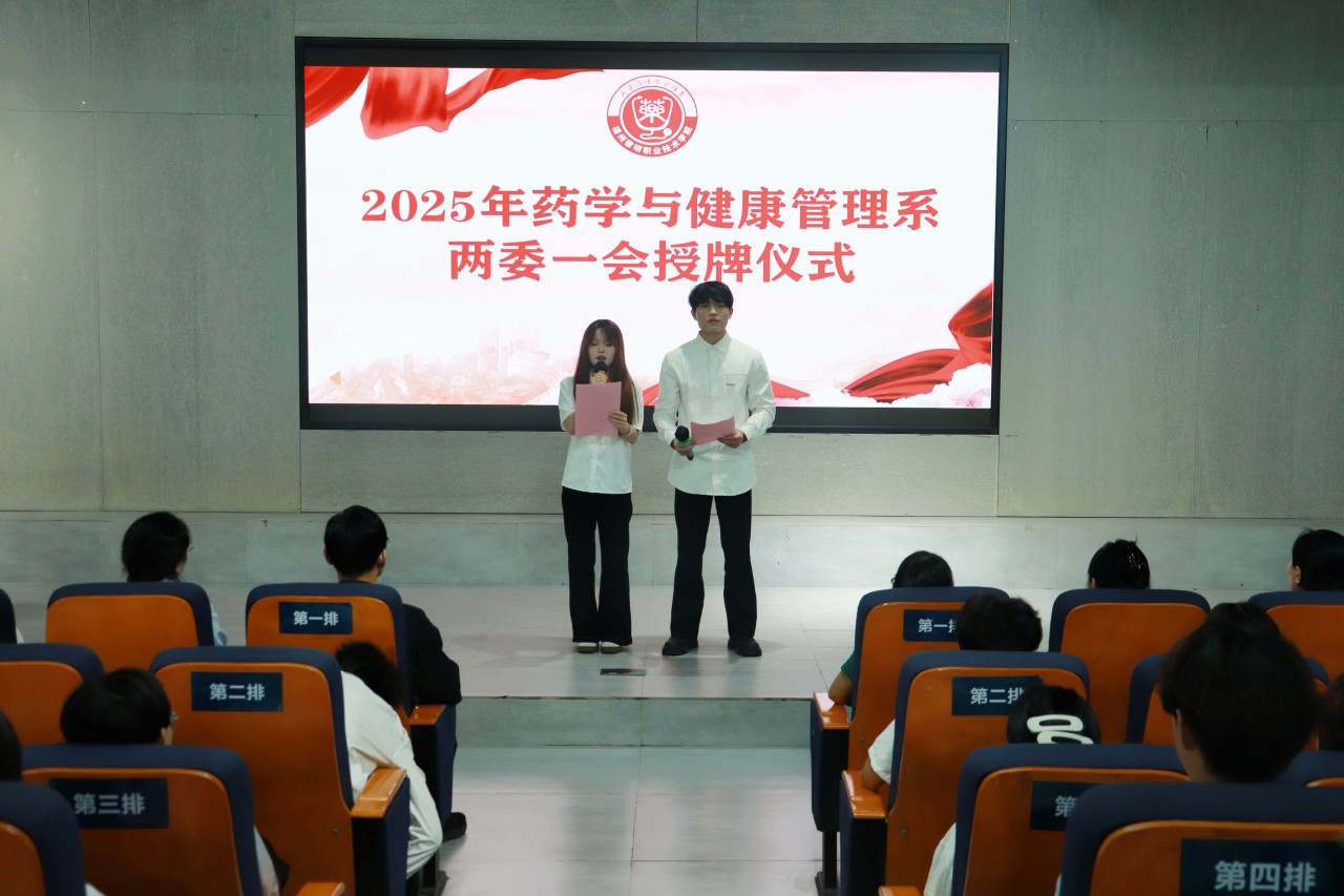 为了增强学生干部的责任意识与工作热情,营造积极向上的服务氛围,2025年10月15日15:00,药学与健康管理系在小圆楼隆重举行了新一届干部干事授牌仪式。系主任曾建雄老师、系党支部副书记郑爱清老师及全体辅导员、专任教师与 200 余名学生代表共同见证这一庄重时刻。