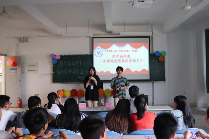 6月17号下午三点半由药学系举办两委干训班结业暨学生干部竞选大会在阶梯三教室正式举行,本次大会到场的嘉宾分别有党支部书记郑爱清老师、辅导员王春萍老师、辅导员姚冠华老师、大二学生干部以及两委的干事们。