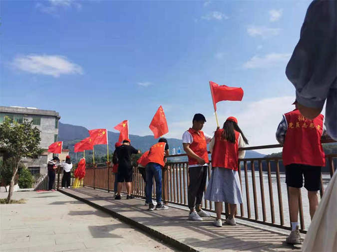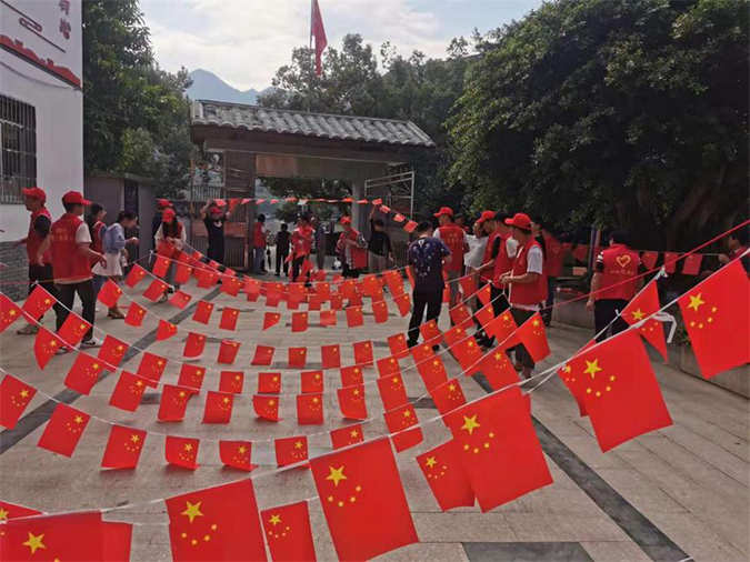 此次活动,30名志愿服务者深入共建社区,大家齐心协力,在共建场地高挂五星红旗,不多时,村委、沿河护栏、学生街等主要干道已被红旗环绕,红旗飘飘,象征着祖国一路走来的辉煌业绩。广大民众纷纷表示感受到了庄重而热烈的浓重节日氛围。