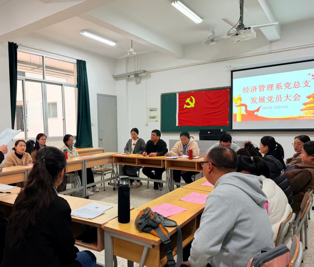 为严格规范党员发展程序,持续夯实基层党组织战斗堡垒作用,为党组织注入新鲜活力,2025年12月24日上午,经济管理系党总支在综合楼205教室隆重召开接收预备党员大会。党总支全体党员参会,会议由党总支书记孙丽平同志主持。
