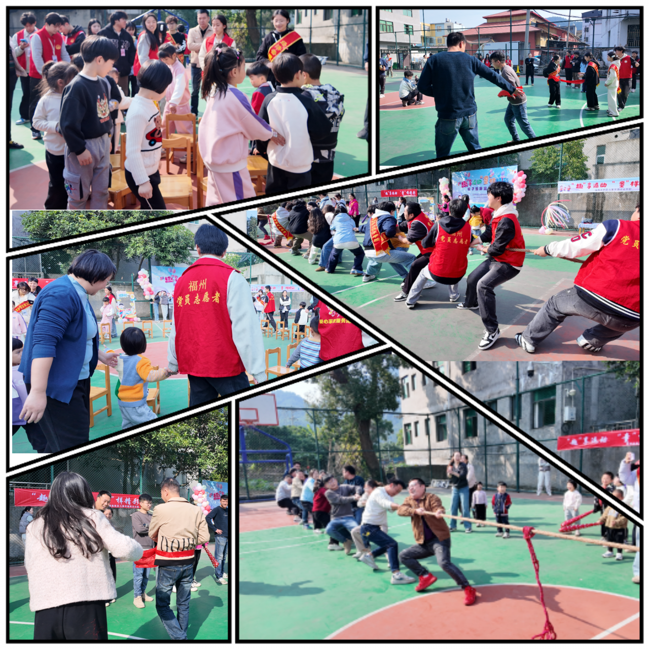 室外赛场同样精彩迭起,志愿者们的高效协作让活动氛围持续升温。“椅子大冒险” 环节,他们快速调整座椅摆放,配合音乐节奏引导亲子参与,音乐骤停时,大小身影争抢座椅的忙乱与欢呼,让温馨感翻倍;“腰缠万贯” 红绸传递中,志愿者们协助亲子家庭系好红绸,讲解规则要点,亲子携手并肩比拼速度与默契,欢乐氛围感染全场;压轴的拔河赛里,志愿者们担任裁判、拉起安全线,家长队与幼儿队各自发力,红绳的每一寸移动都牵动着全场的呐喊与助威,不分胜负的较量中,传递的是团结拼搏、乐于分享的正能量,而志愿者们公正执裁、贴心服务的身影,也赢得了现场家长与老师的一致好评。