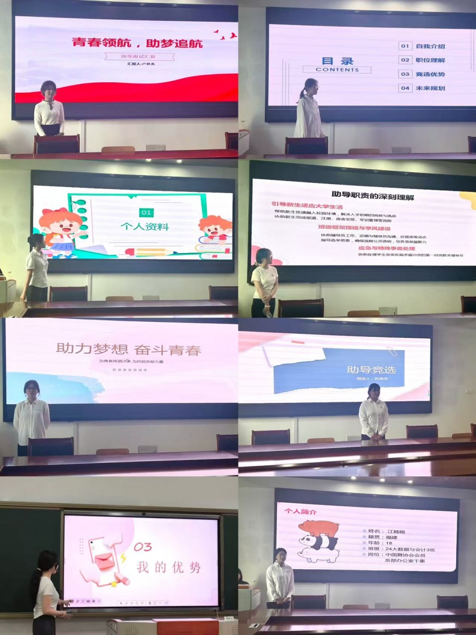 竞选环节分为个人演讲和现场答辩两个部分。在演讲环节,竞选者们或慷慨激昂,或娓娓道来,充分展现了经管学子良好的精神风貌。他们自信昂扬,将个人优势娓娓道来,分享对助导工作的独到见解,描绘未来的工作蓝图。每一句话语都饱含着对新生的关爱,每一个眼神都传递着对助导工作的赤诚。有的竞选者讲述自己在学院“爱的教育”氛围中收获成长的故事,希望将这份温暖与经验传递给即将入学的学弟学妹;有的则着重强调自身出色的沟通能力与团队协作精神,立志以爱为桥梁,与新生建立紧密联系,为他们提供全方位、有温度的帮助。