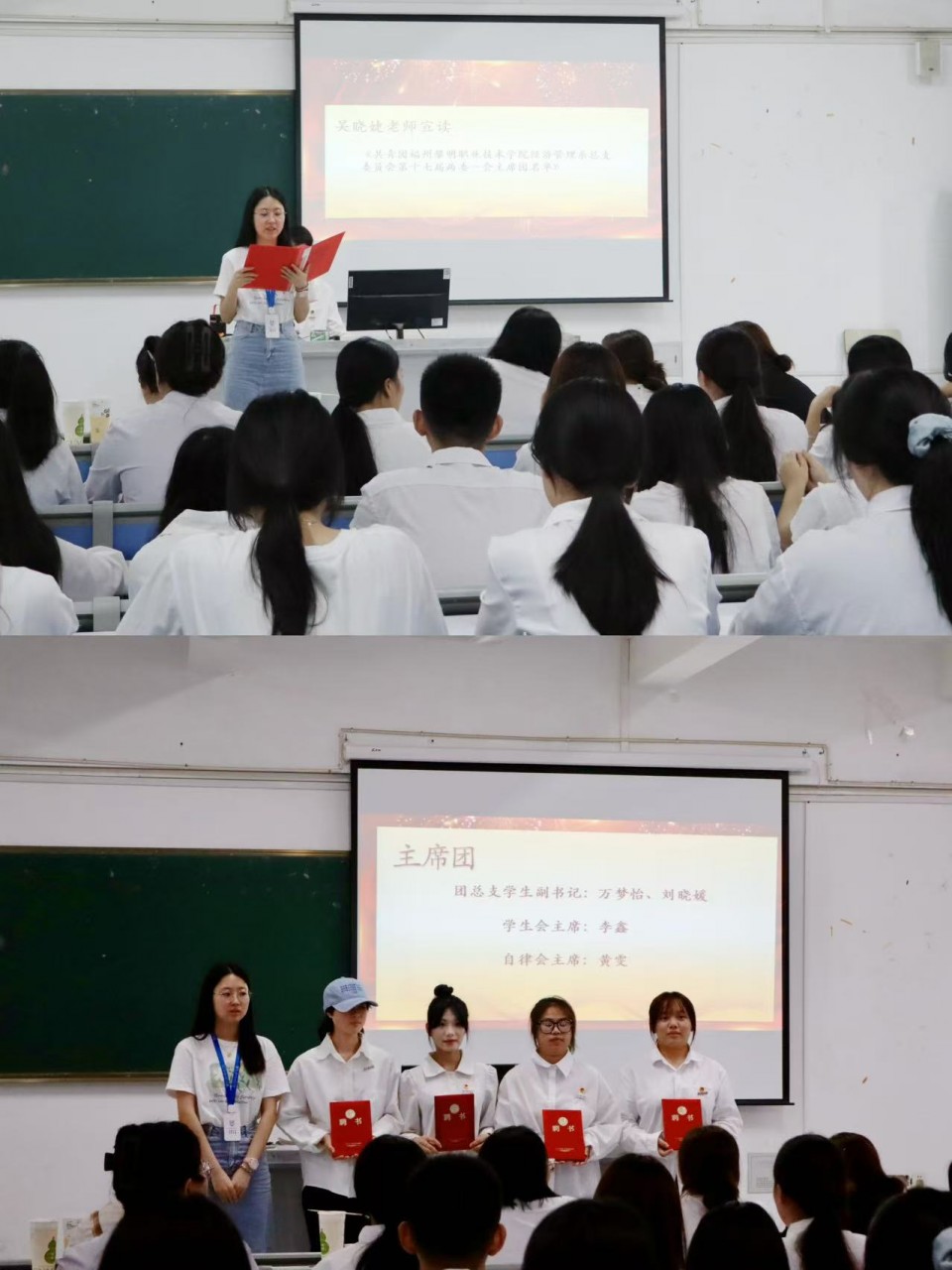 活动在合唱共青团听歌中开场。吴晓婕老师宣读新一届主席团成员名单,并为他们颁发聘书。主席团成员接过聘书,眼神坚定,现场掌声热烈,责任与使命得以传递。