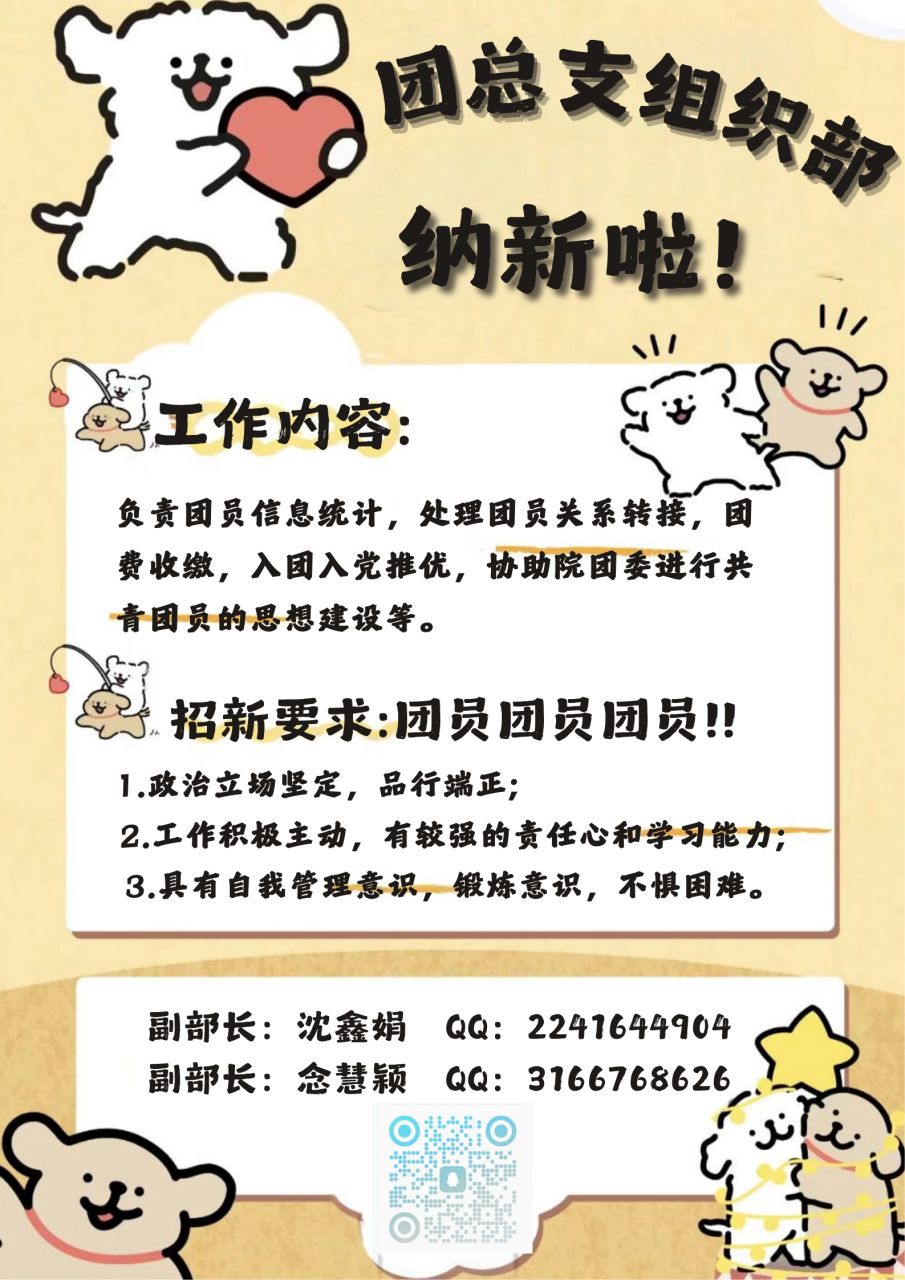 3.积极向上,责任心强,热爱团学工作,具备优秀的组织、沟通及社会实践能力。