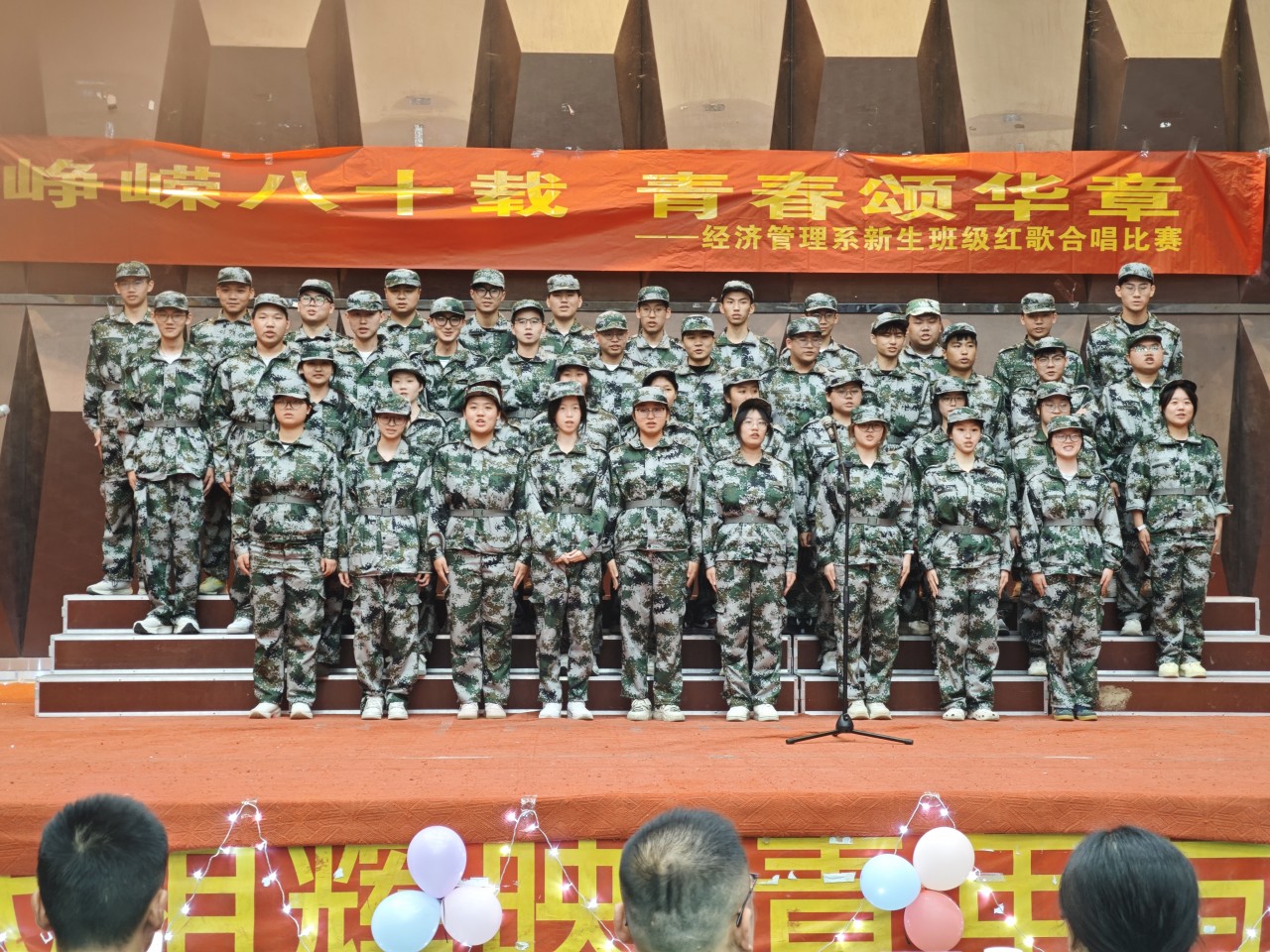 比赛现场灯火璀璨、气氛热烈。各班级参赛队伍身着整齐服装,精神抖擞依次登台。《我爱你中国》旋律悠扬,饱含对祖国的深情眷恋;《我和我的祖国》节奏激昂,唱出青年与祖国的血脉相连;《精忠报国》铿锵有力,尽显民族不屈气节;《保卫黄河》雄壮豪迈,再现中华儿女抗敌壮志;《团结就是力量》《没有共产党就没有新中国》耳熟能详,传递出凝心聚力、紧跟党走的坚定信念。参赛队伍以饱满热情与精湛演技,赢得现场阵阵掌声与评委一致好评。