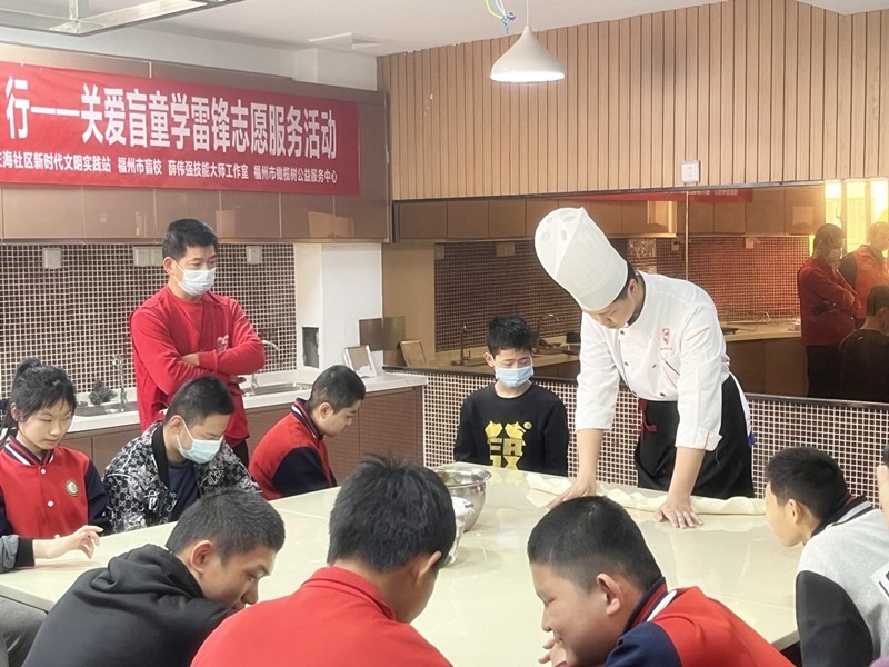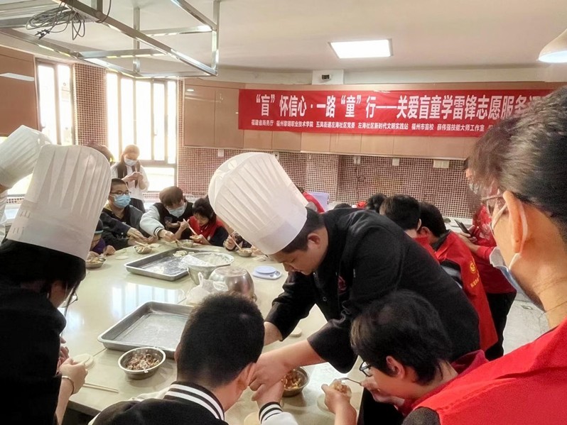 我系师生4人、技能大师工作室领办人薛伟强应邀共同前往福州盲校教授学生烹饪技能。主要教授三项技能,分别是包水饺,烤蛋挞,炒五彩鸡丁,希望通过此次活动让他们掌握一些生活技能,燃起对生活的热爱。