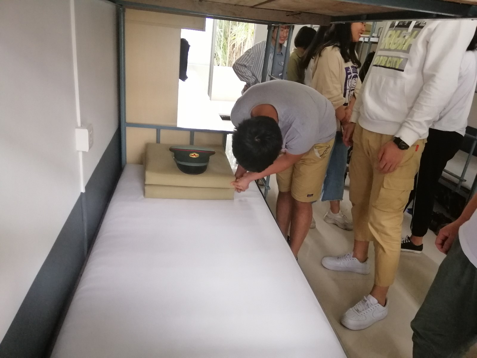 走进宿舍,当全体师生看到宿舍整理得干净整洁时,都无不发出赞美之声。宿舍里的东西摆放的是那样得有条不紊,副队长向大家介绍内务被子的折叠和位置、床铺整理、生活用品、鞋的规范摆放、室内整体清洁程度标准和要求,让我们发现自己的不足和差距。标准的方块状被子,像一块用刀切过的豆腐似的,床单洁白如雪,找不到一丝污垢。他们的宿舍里没有一处私人领域,他们的衣服和鞋子都是统一摆放,即使是在衣柜里面的衣服也是平整无痕。看着他们的内务,同学们不禁感到惭愧。