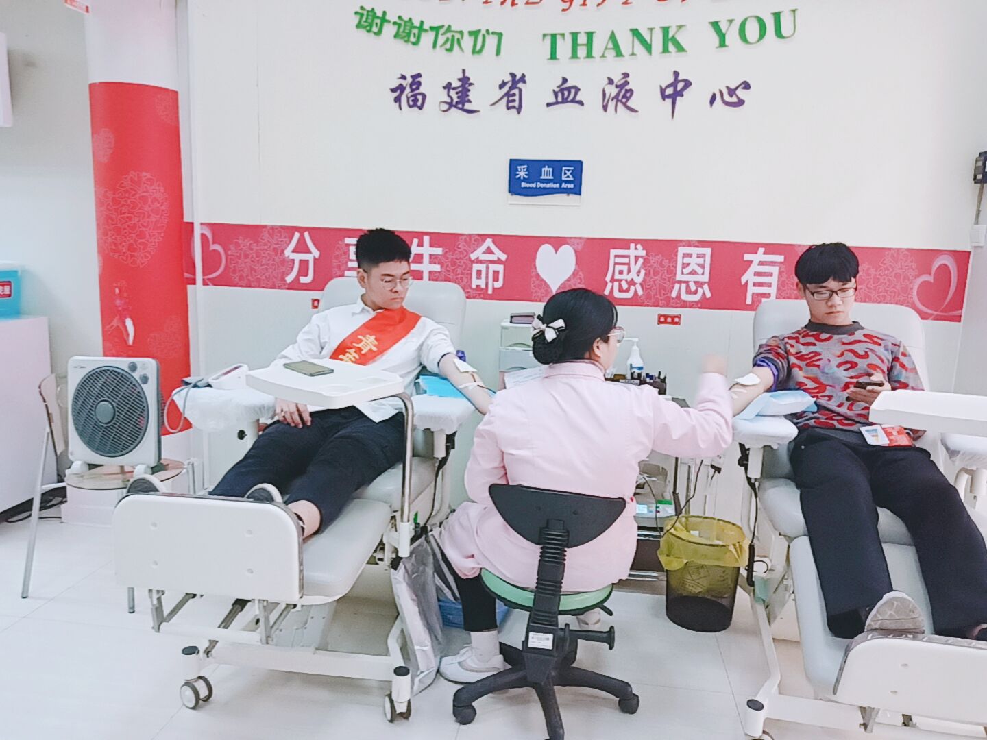 14日上午8:30,同学们在校门口集合后,怀揣着激动紧张的心情,来到献血屋。在经过一系列的检查后,早已准备好的同学们纷纷伸出了胳膊……猩红的鲜血,带着同学们的期盼,带着那些希望受血者早日康复的祝福,缓缓地流淌在抽血管,一根小小的管子连接了同学们的期盼和受血者的希望。护士姐姐在献血过后给同学们分发了葡萄糖和面包,并专门准备了地方用于同学们休息,缓解同学们生理上的不适。不一会儿,这些年轻人便又恢复了朝气与蓬勃,他们带着自豪笑容,迈着大步向阳光走去,他们的前途是光明的。