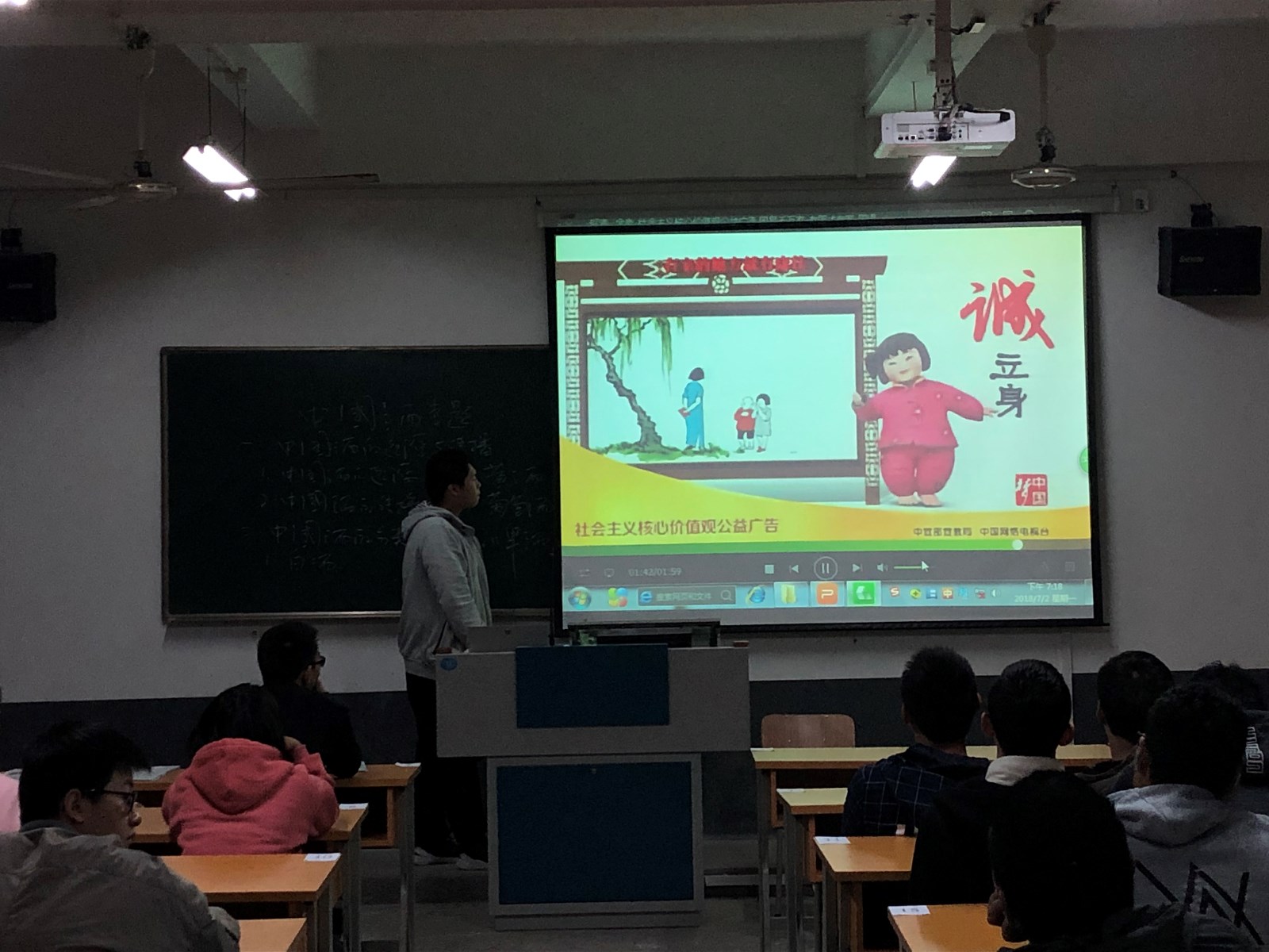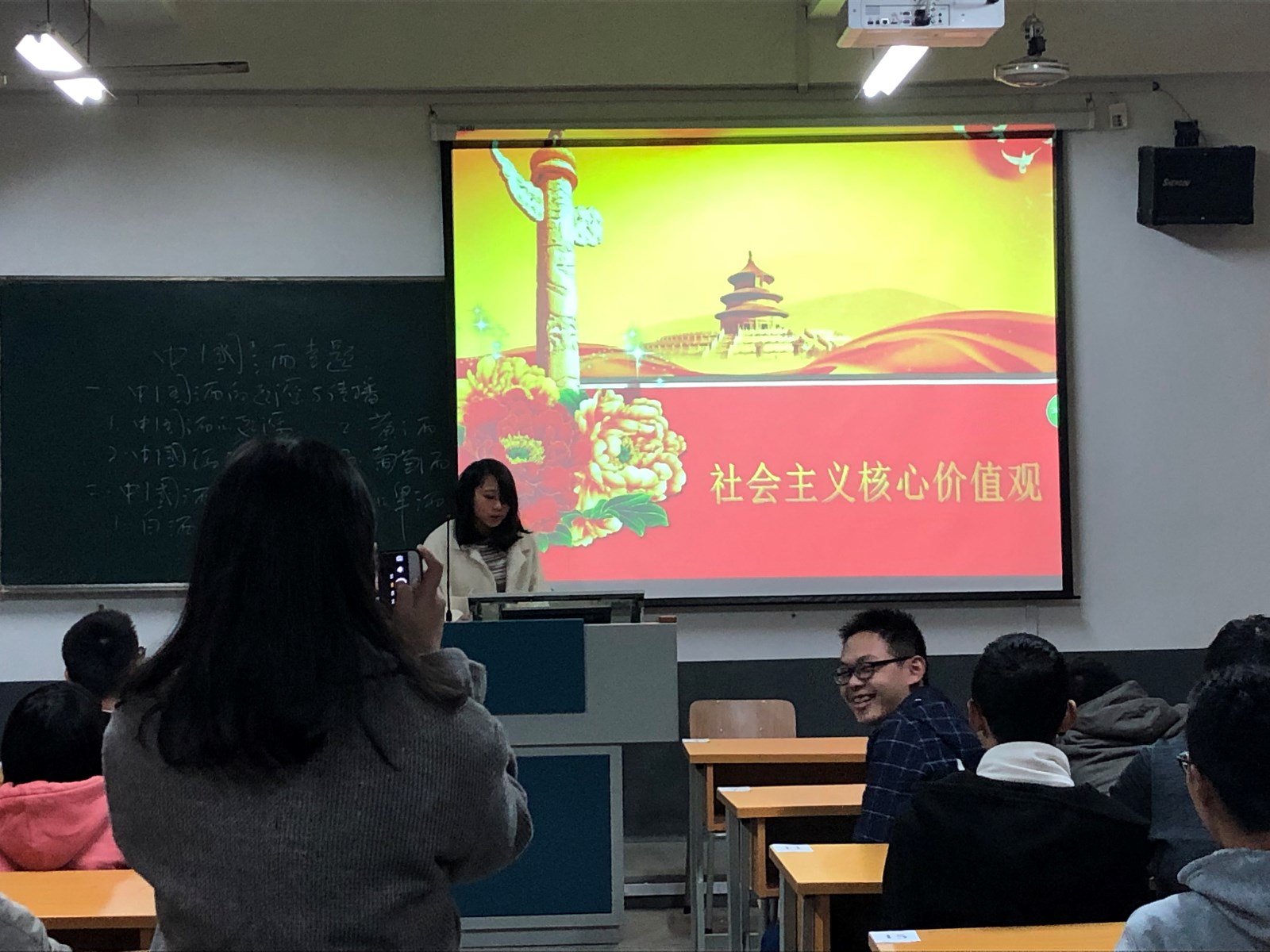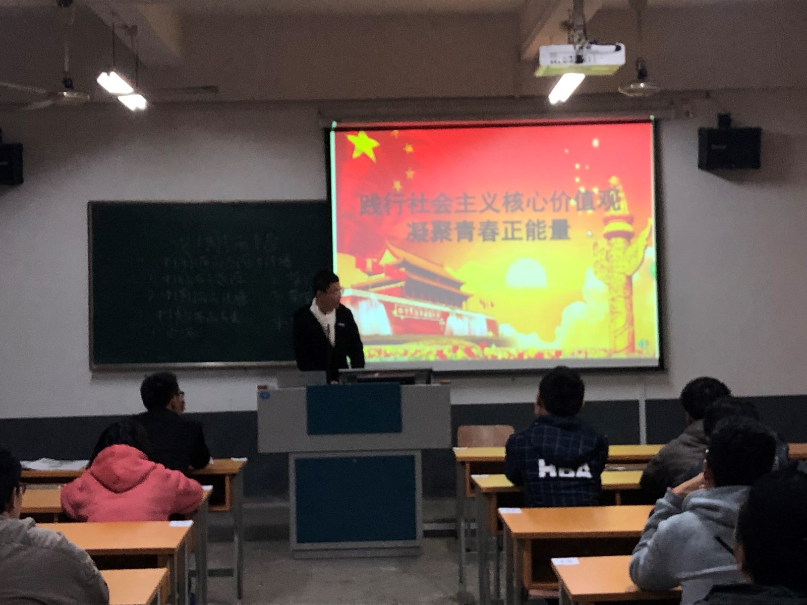 会上,陈震、李日燊和许媛三位同学,从不同方面给我们介绍了社会主义核心价值观的内容。李日燊同学用一段简短的视频,告诉大家什么是孝、诚、善;陈震同学用身边好人的事例告诉我们在日常生活中,我们该向谁学习;许媛同学告诉我们大学生要怎么践行社会主义核心价值观。