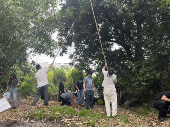 活动当天,参与教职工早早集结,工会工作人员已备好长竹竿、塑料布、竹篮等工具。大家沿着后山蜿蜒的步道前往橄榄林,基地负责养护的工人提前等候在林间,结合多年养护经验,向大家演示橄榄采摘的技巧:“橄榄果蒂虽脆,但高处枝条不好够,咱们用长竹竿对准果实密集的枝条轻轻敲打就行,注意别太用力伤了树。记得在树下铺好塑料布,接住掉下来的果子,既干净又省劲儿。” 一番细致讲解后,教职工们自由结对分散到林间,迅速投入到采摘行动中。