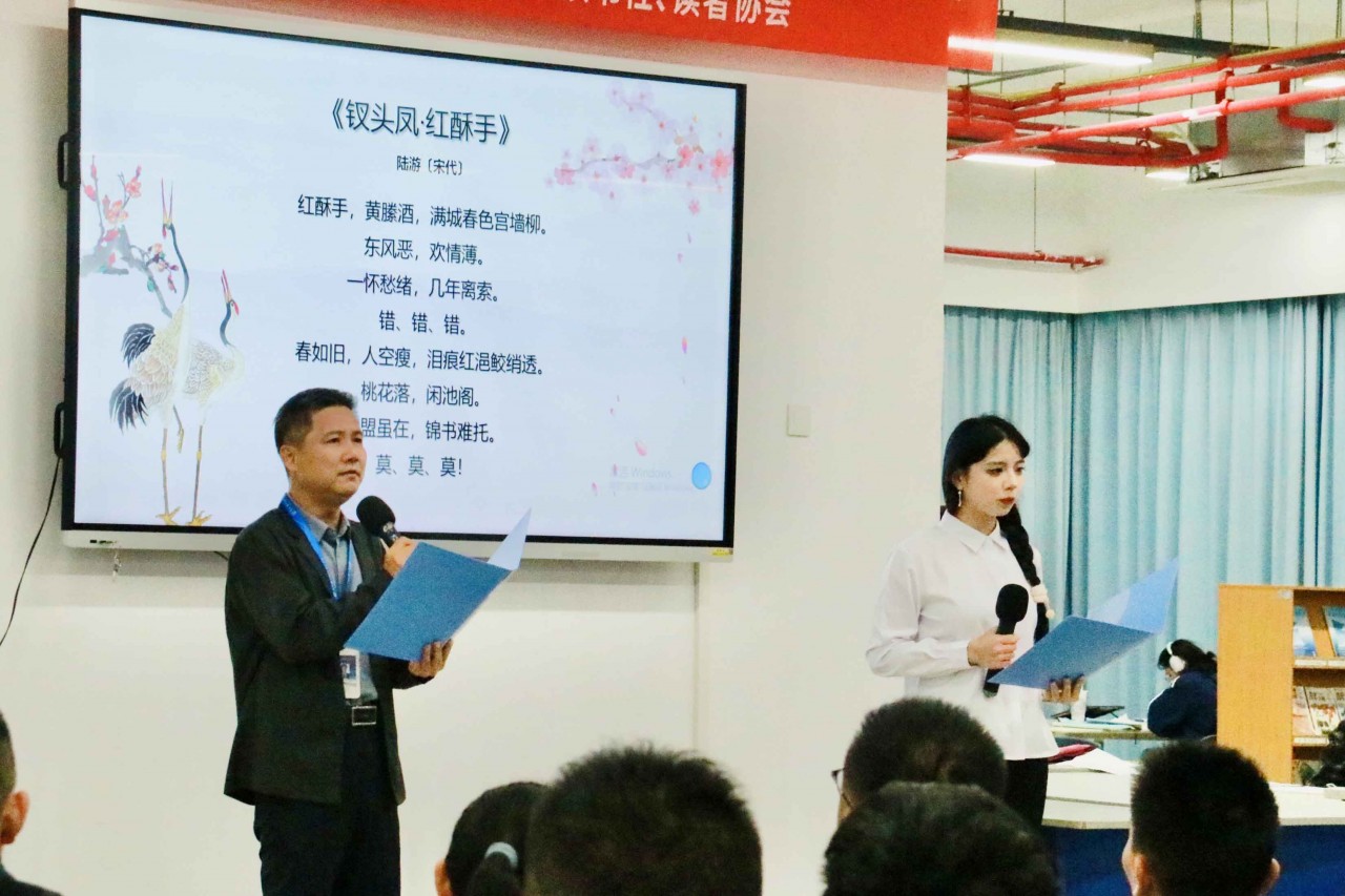 友情表演环节由图书馆黄琪涵、刘宇豪老师合诵《唐诗里的中国人》,为观众打开唐诗唯美的诗画想象空间;廖诗忠书记与艺建系陈宏雁同学合诵陆游、唐婉的《钗头凤》,哀怨、凄美的千古绝唱,令观众仿佛穿越时空,伫立沈园,慨叹“山盟虽在,锦书难托”的无奈与遗恨。领导与学生同台表演,精彩震撼人心,掌声无比热烈。