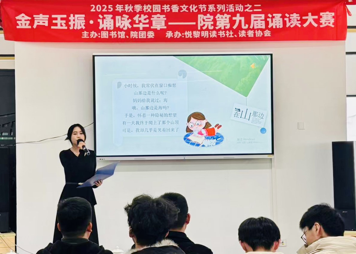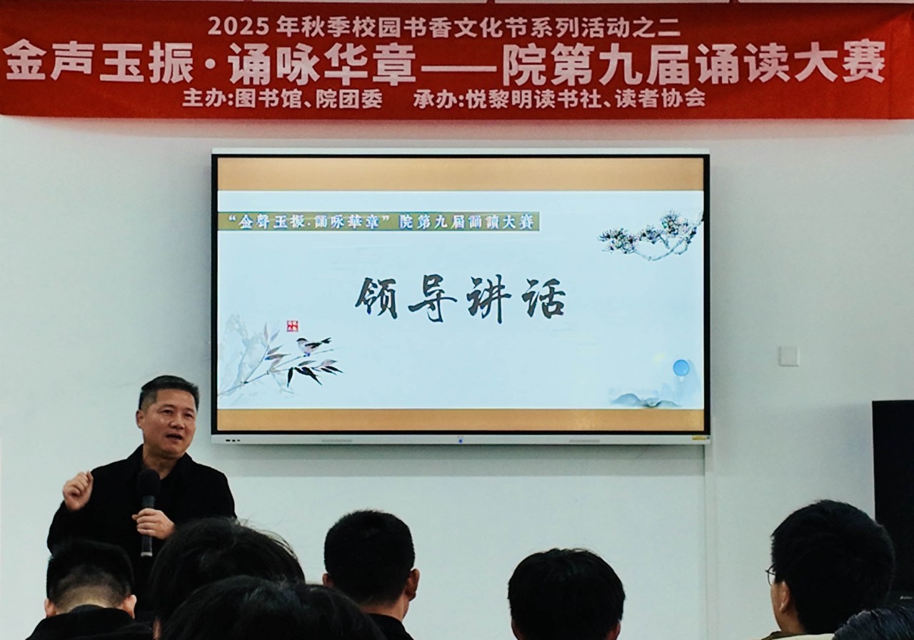 12月17日下午,由图书馆、院团委联合主办的《金声玉振•诵咏华章》——第九届校园诵读大赛决赛在图书馆隆重举行。范超峰院长、院党委廖诗忠书记等学院领导一行亲临现场,与部分处(室)负责人、参赛选手及师生代表130多人,共同观赏了这场诗意盎然的诵读盛会。