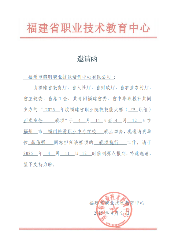 2025年4月11日—12日,2025年度福建省职业院校技能大赛(中职)中式烹饪赛项在福建省福州旅游职业中专学校举行。薛伟强技能大师受邀担任赛项执行。