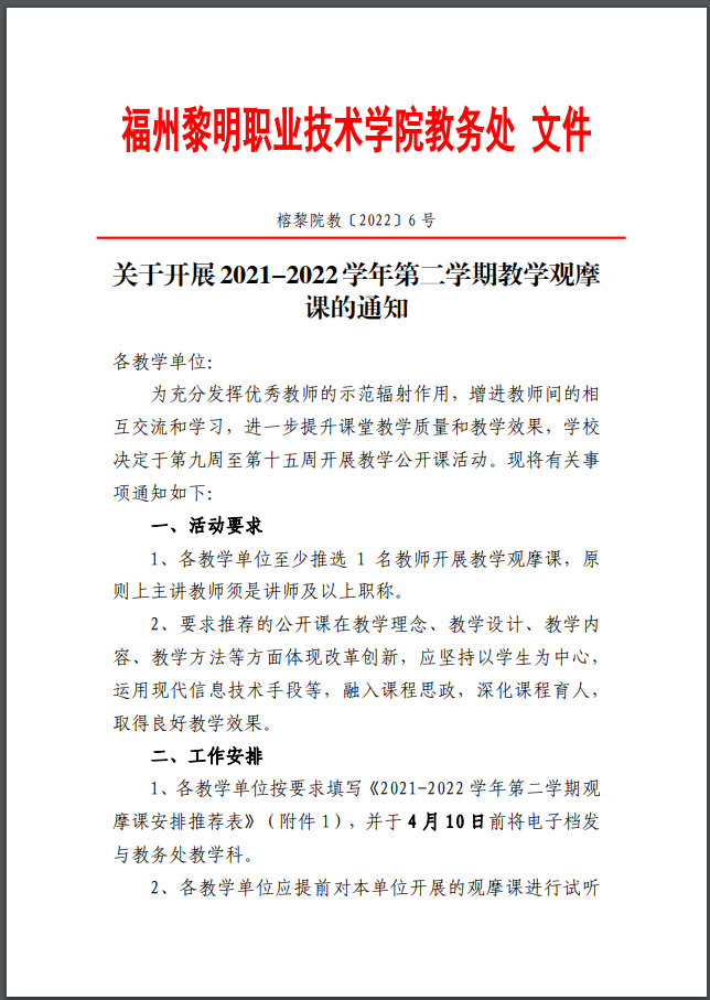 关于开展2021-2022学年第二学期教学观摩课的通知