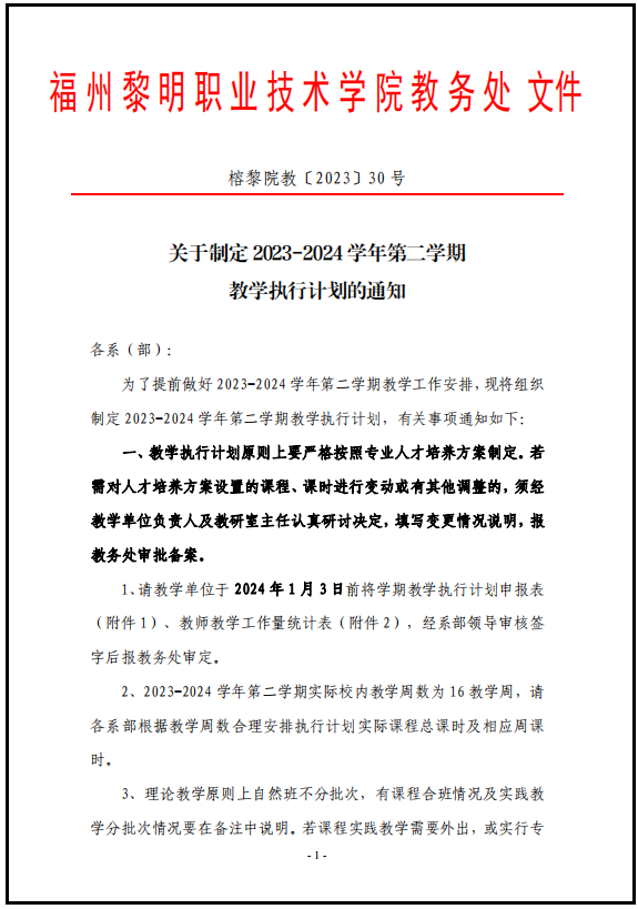 关于制定2023—2024学年第二学期教学执行计划的通知